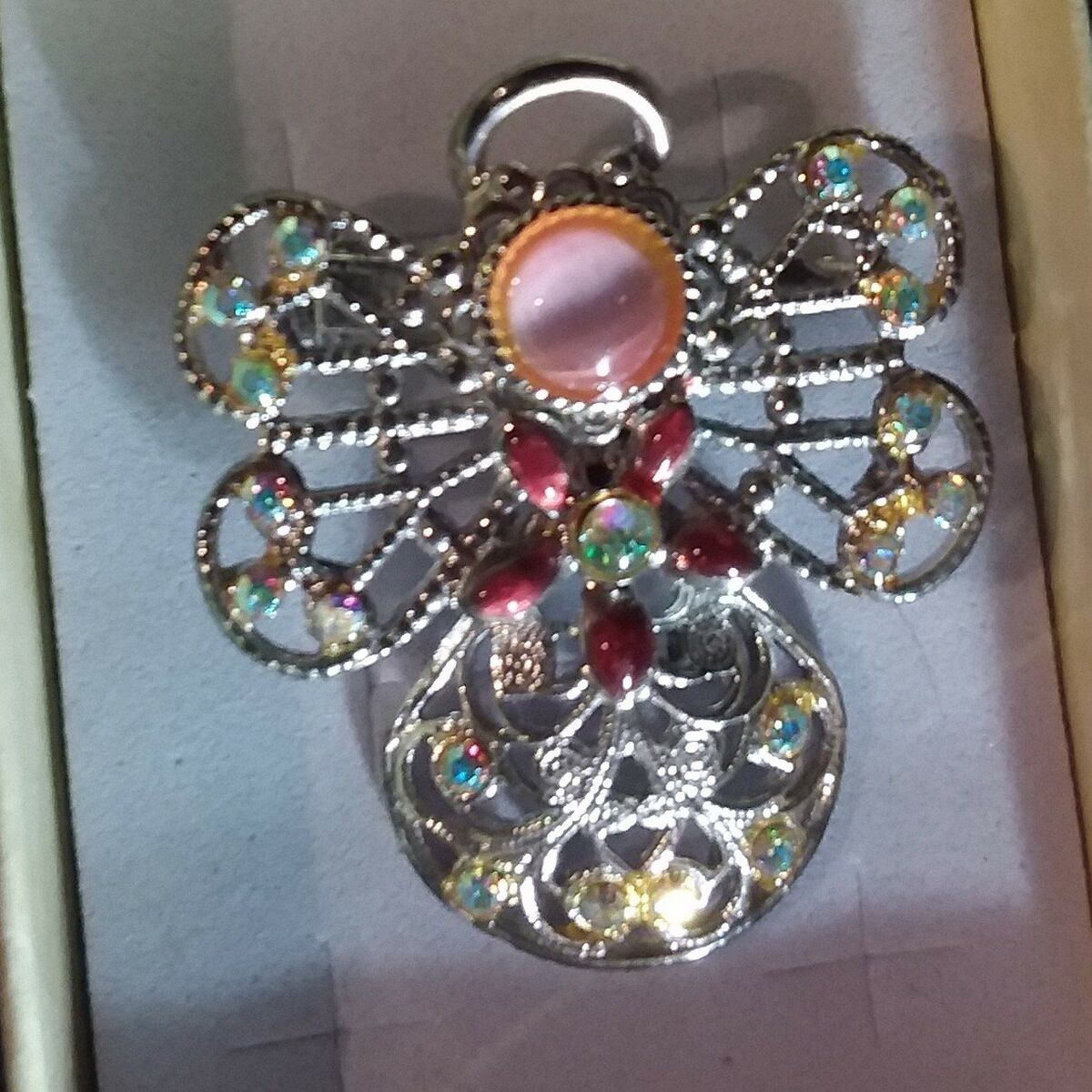 Silver angel pin, sparkly rhinestones, comes in a gift box..