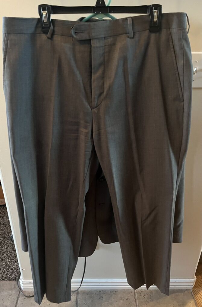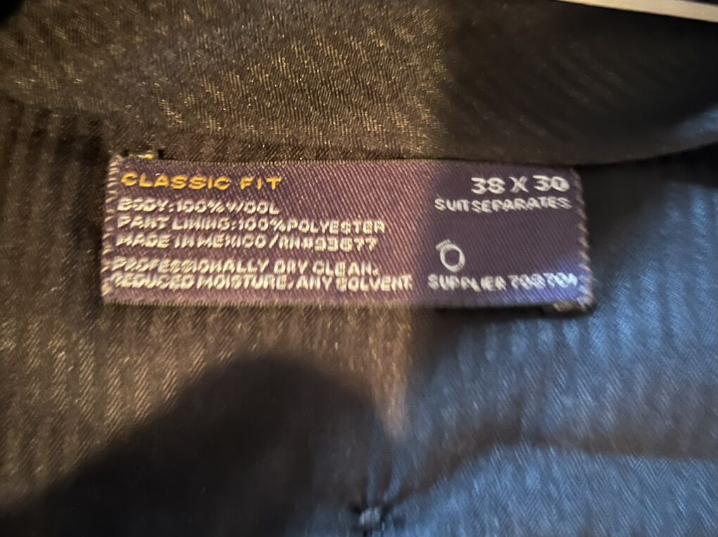 VenmoMen’s suit. I can’t find the tag on the jacket but I think the jacket is 46 Reg 100% wool pant lining is 100% polyester. Pants size is 38 x 30. I have four other suits listed that are all about the same size if you’re interested in purchasing multiple suits.