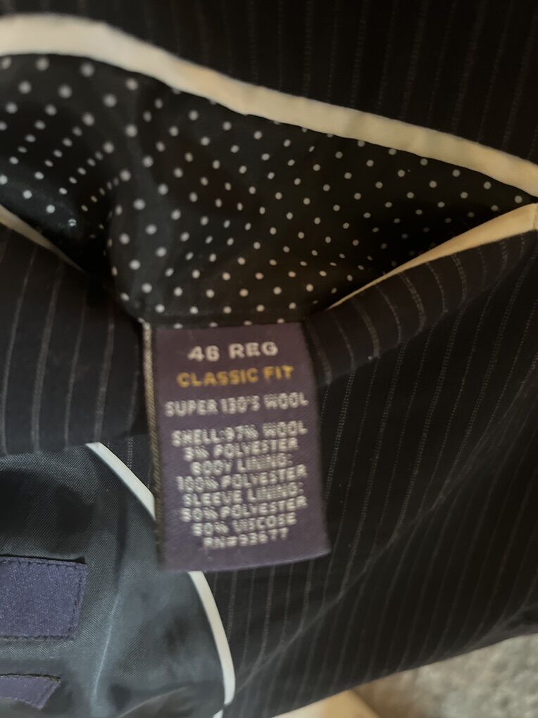 VenmoStafford men’s suit. Jacket is 46 Reg. Pants are 97% wall 3% polyester. Suit pants size 38 x 30. I have four other suits listed that are roughly the same size if you’re interested in getting multiple suits.