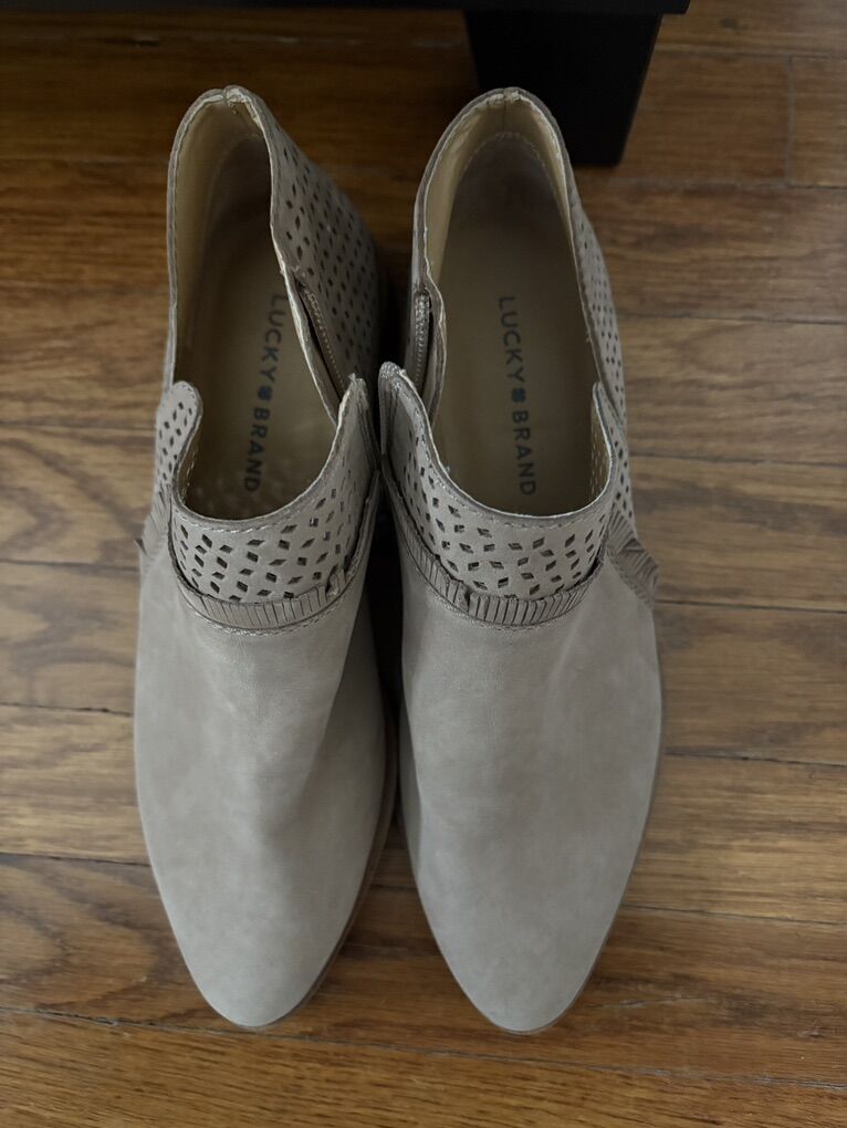 VenmoNWOB Lucky Brand Pakpao Ankle Boot. Size 8 Color Beige Nubuck. The leather Pakpao bootie from Lucky Brand will elevate your casual shoe collection! This ankle bootie is fashioned with an asymmetrical topline, laser cut-outs and fringe detailing for extra allure! Features Laser-cut leather upper, Inside zipper closure, Round toe, and 1 stacked block heel.