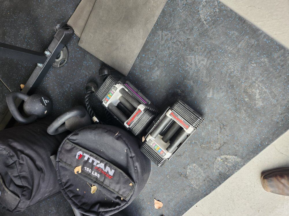 Titan Fitness T2 83" Rack with cable system, weight plates storage, Leg holder- $600 Titan Fitness Y dip bar- $50 Titan Fitness Log Bar- $150 Titan Fitness 9 sleeve barbell Storage -$50 Titan Fitness blue crumb rubber flooring -$125 each (I have 2, but had yo cut a 4'x4' off of one) EZ Curl bar- $40 Titan Fitness Drop pads- $80 Red Synergee (20kg/45lbs) barbell $80 Black ET Energetic (20kg/45lbs) barbell- $80 Powerblock 50lbs adjustable dumbbells $180 Trap Bar- $100 Powerhouse adjustable bench w/Leg Curls attachment $200 240 pound Atlas Stone $75 175 pound Atlas Stone $50