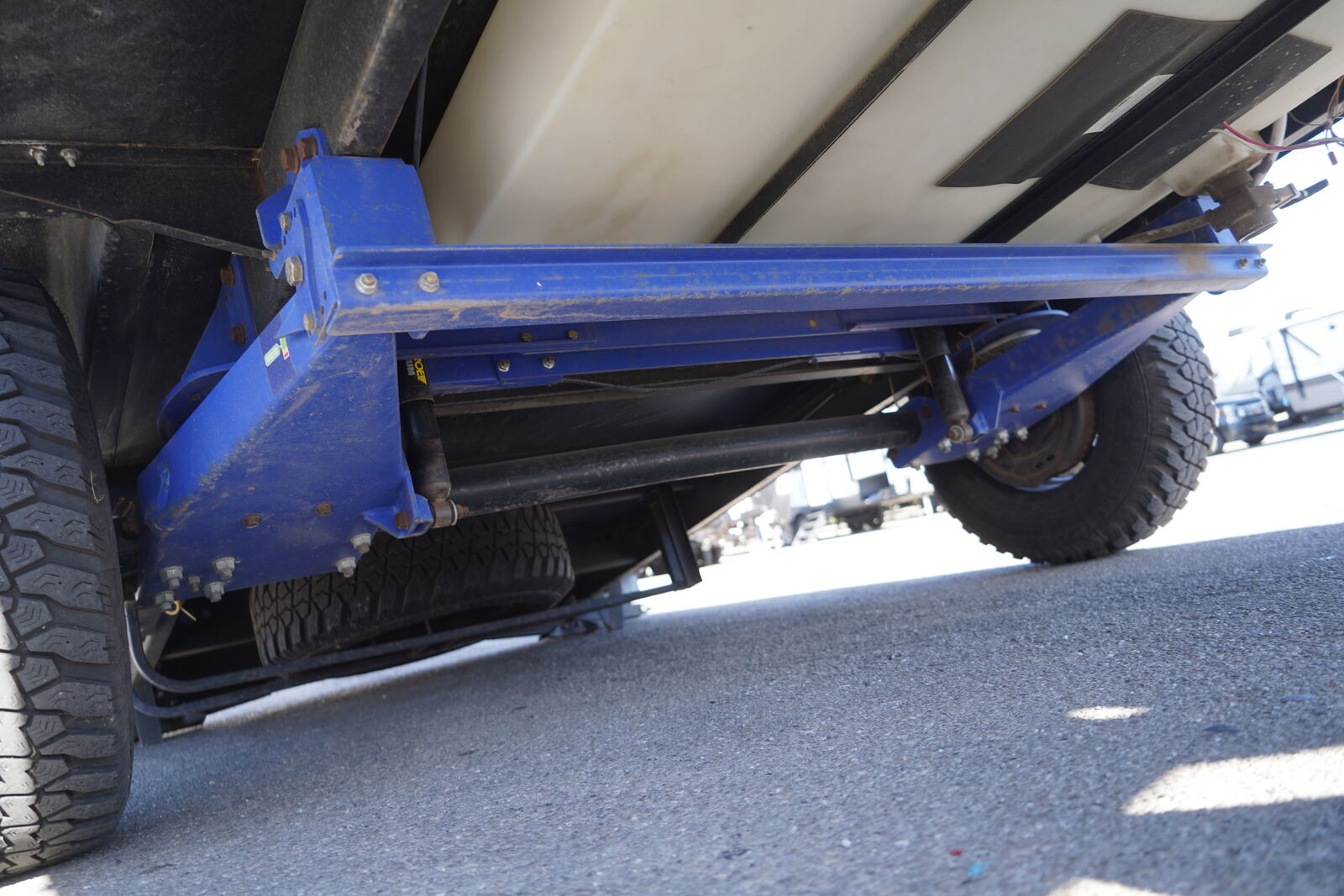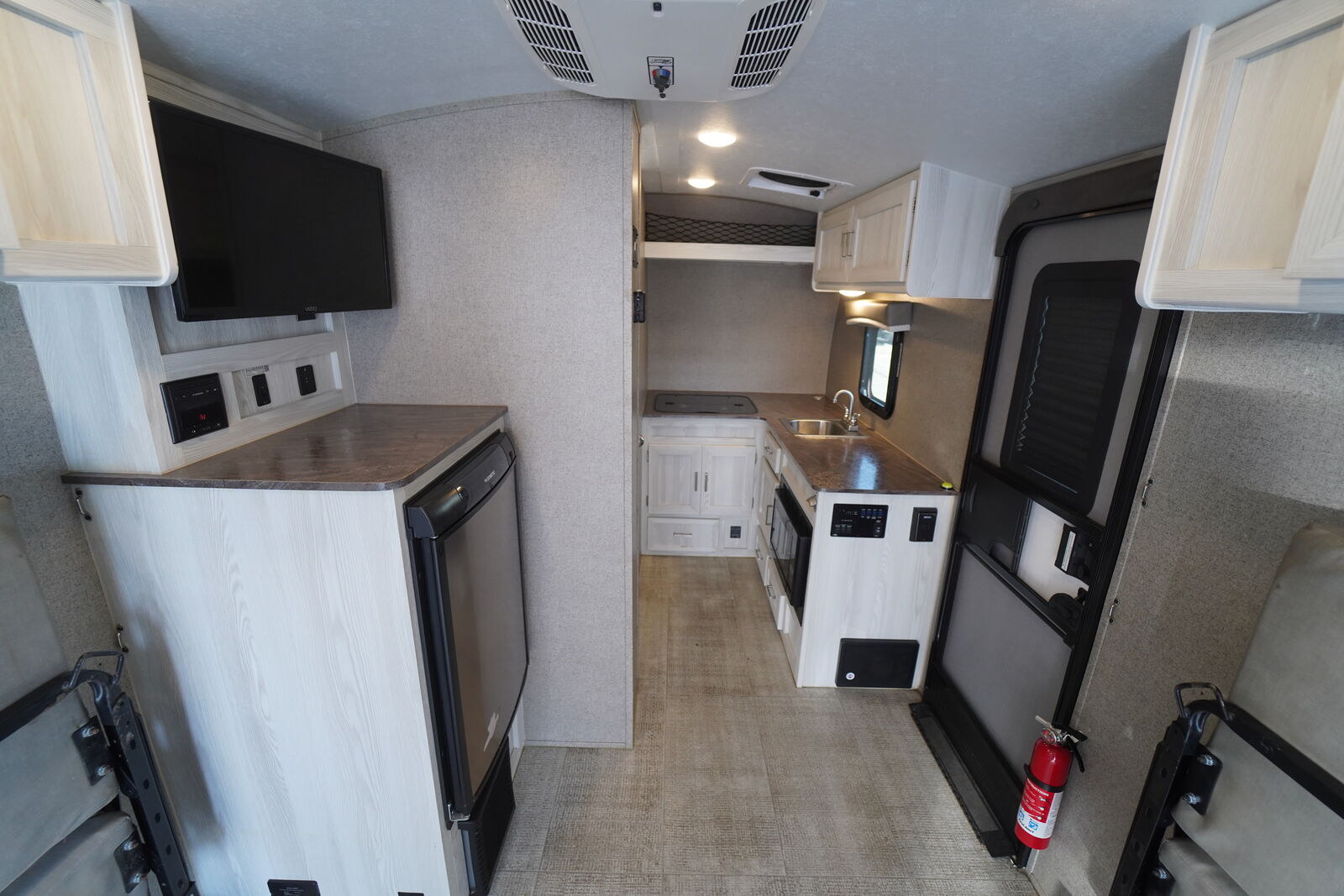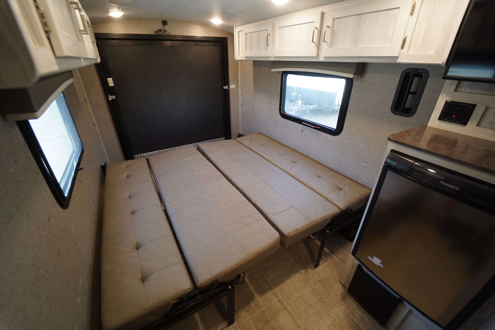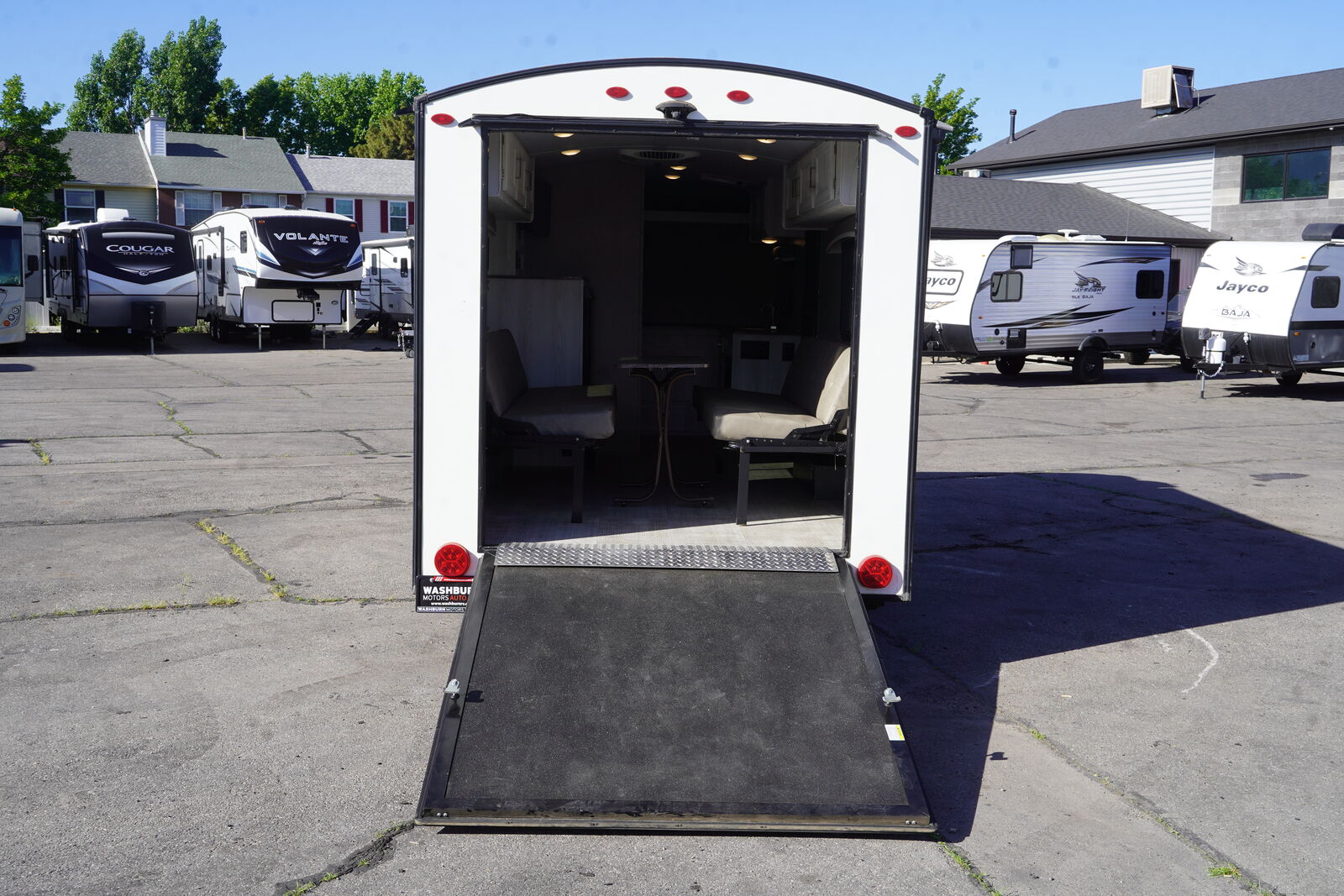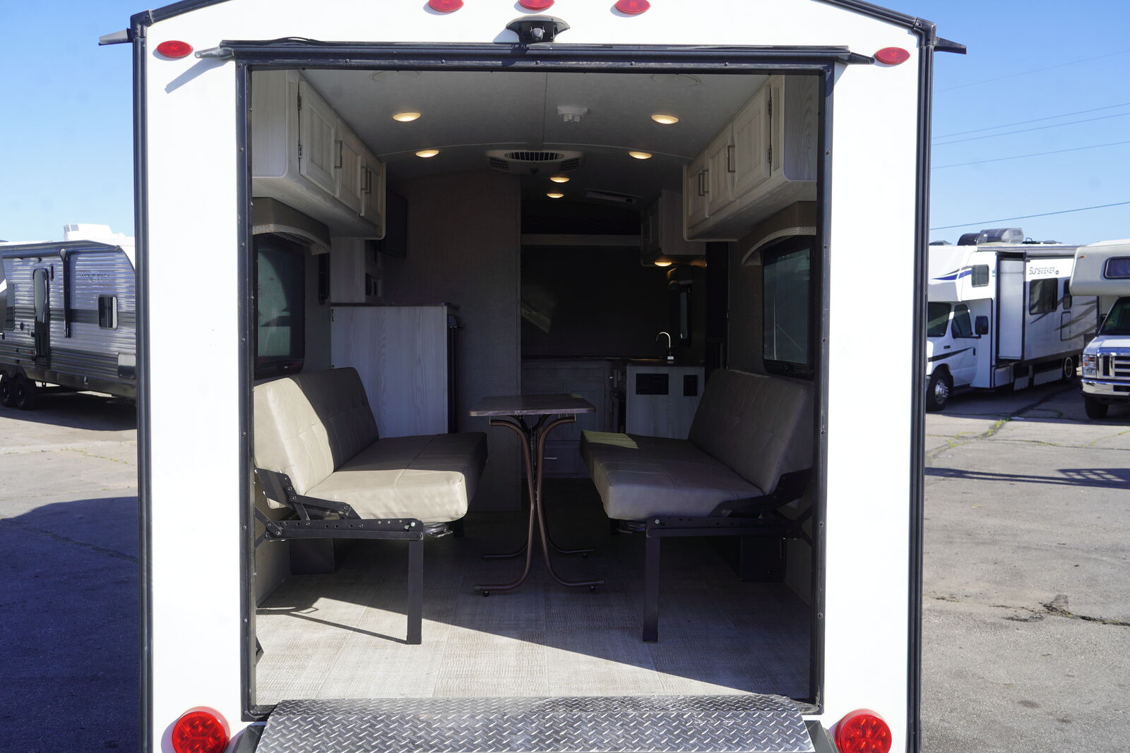 UNBELIEVABLE AIR SUSPENSION WITH ONBOARD COMPRESSOR LIFTS THIS THING AN ADDITIONAL 6 INCHES so you can get this trailer where others can’t go! YOU HAVE GOT TO CHECK THIS ONE OUT!!! This toy hauler’s garage space fits ATVs, dirt bikes, kayaks & MORE!!! Awesome layout with front kitchen and bathroom, and rear cargo area with 2 fold-down couches that fold down into beds.