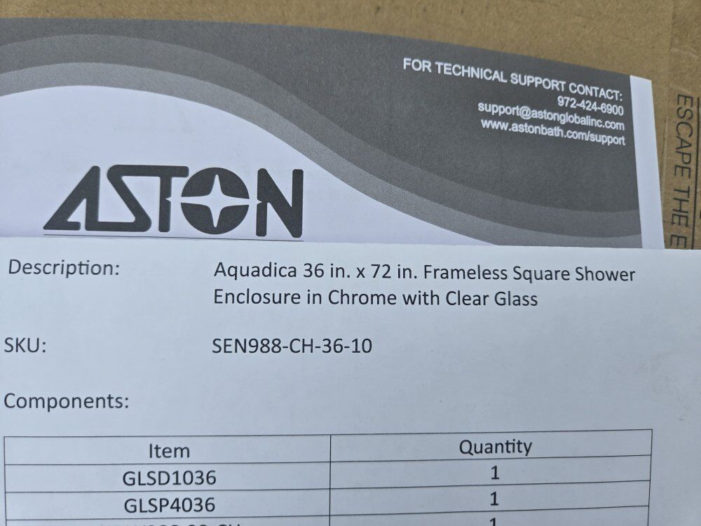 Aston Aquadica 36 in X 72 in Hinged Frameless shower Enclosure Door. New still in box.