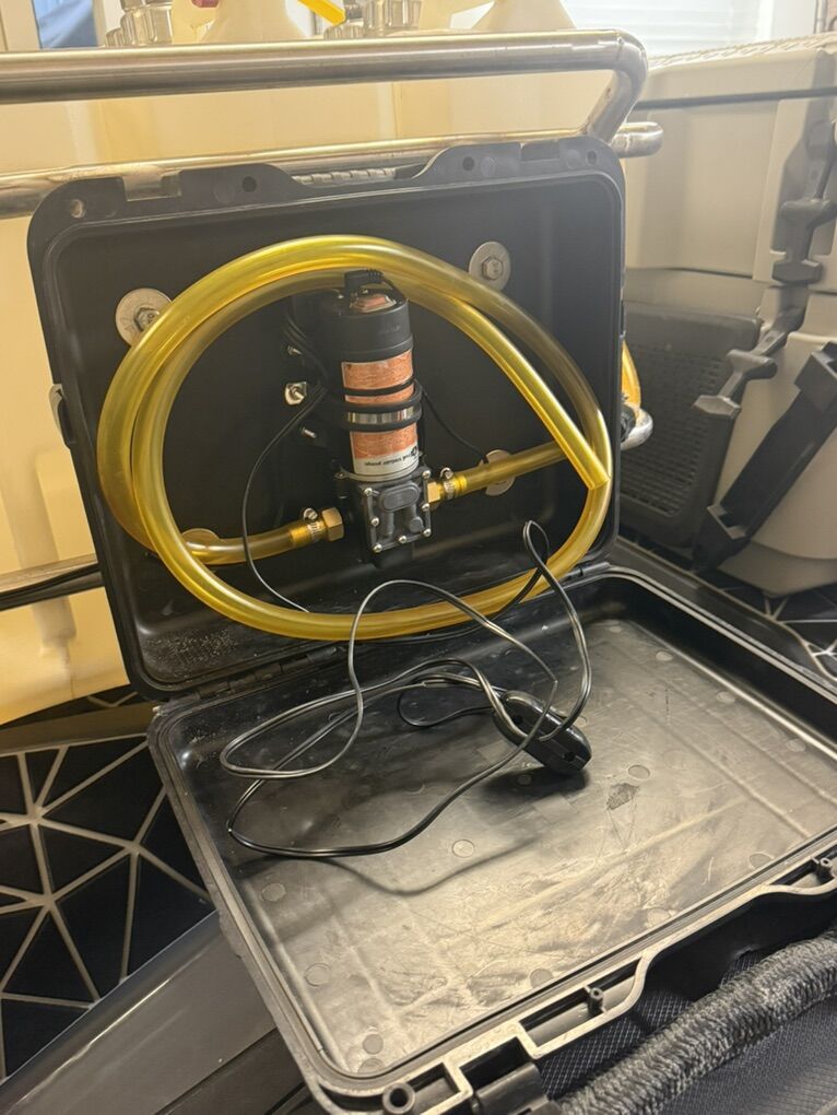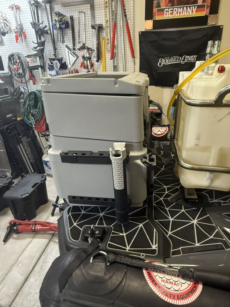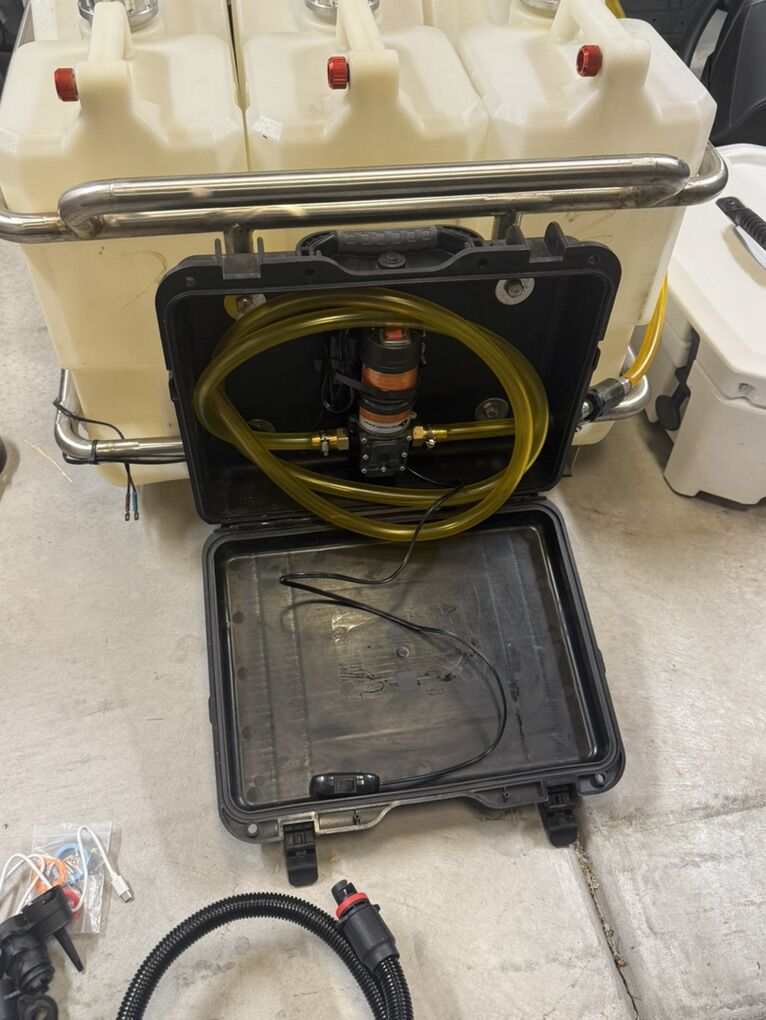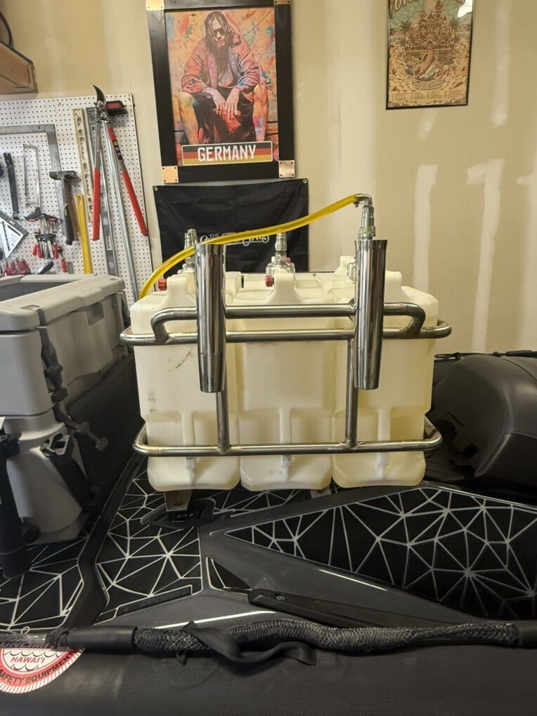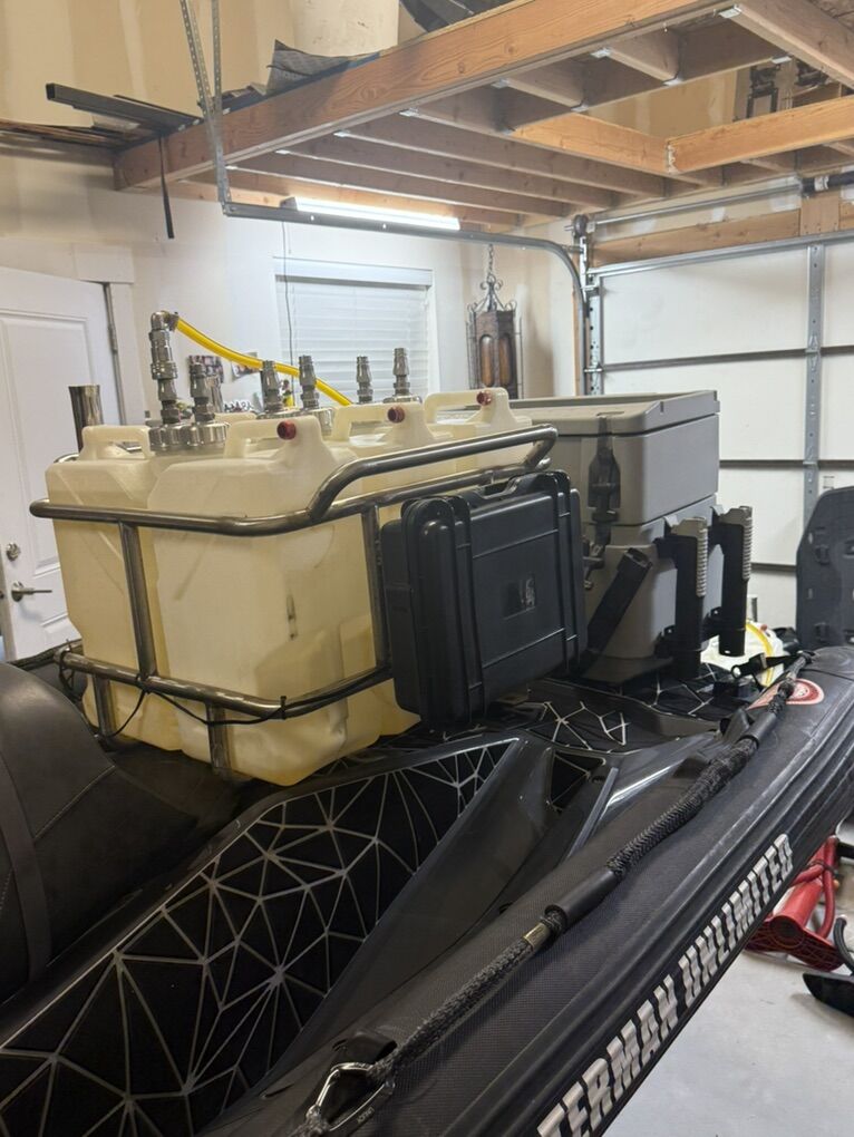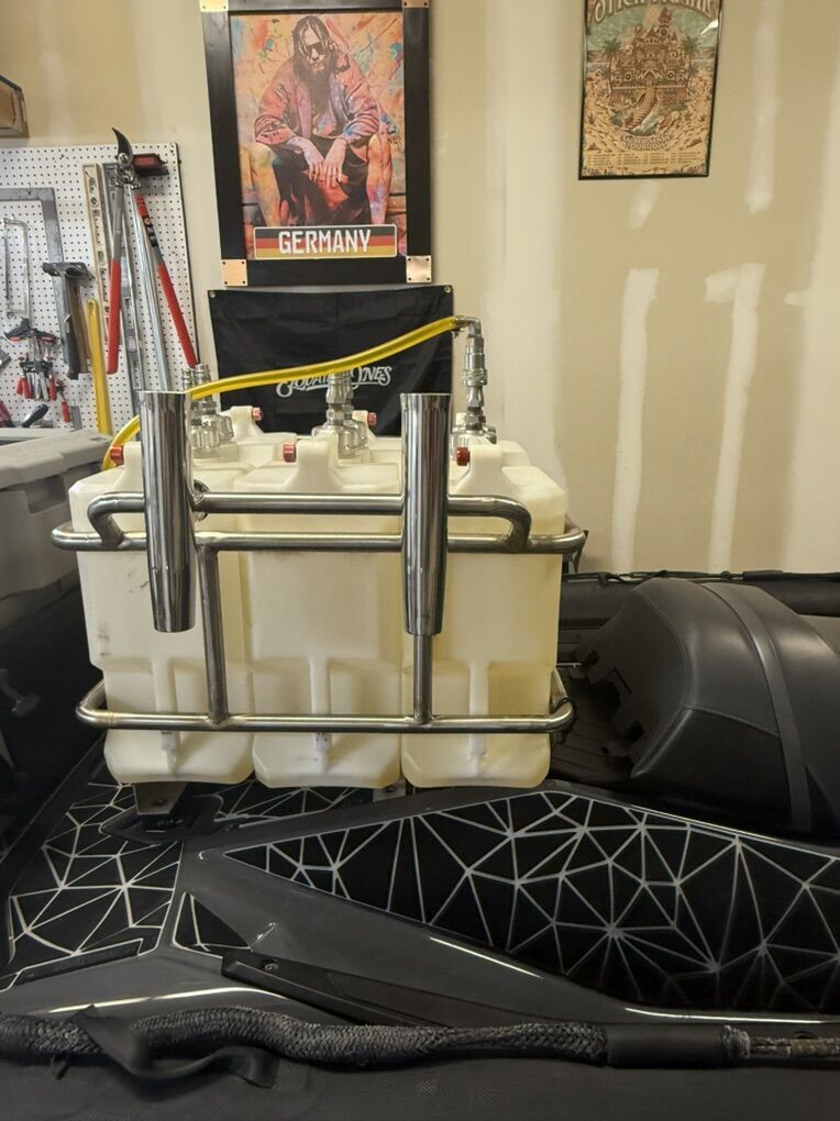 Custom fuel racks built specifically for the RISK fuel jugs. Has external fuel pump so there’s no need to dump jugs on the water. Billet fuel caps and custom dip tubes with quick connect fitting for easy fuel can selection.