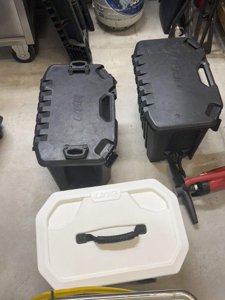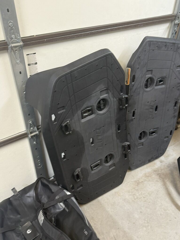 There are a load of accessories that include two LINQ storage boxes, LINQ cargo decks, 100 L LINQ dry bags, small LINQ cooler, large LINQ cooler with cooler attachment, two hand pumps, two L/XL touring life jackets, rechargeable 2way air pump, patch kits for the collars and a few other odds and ends.