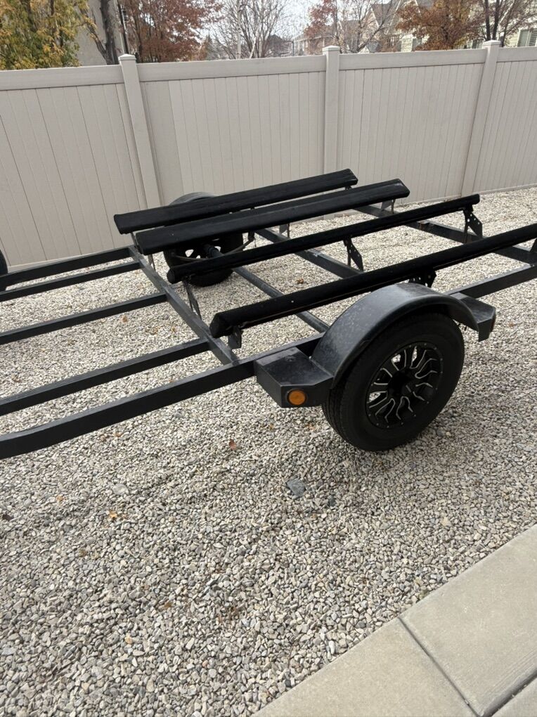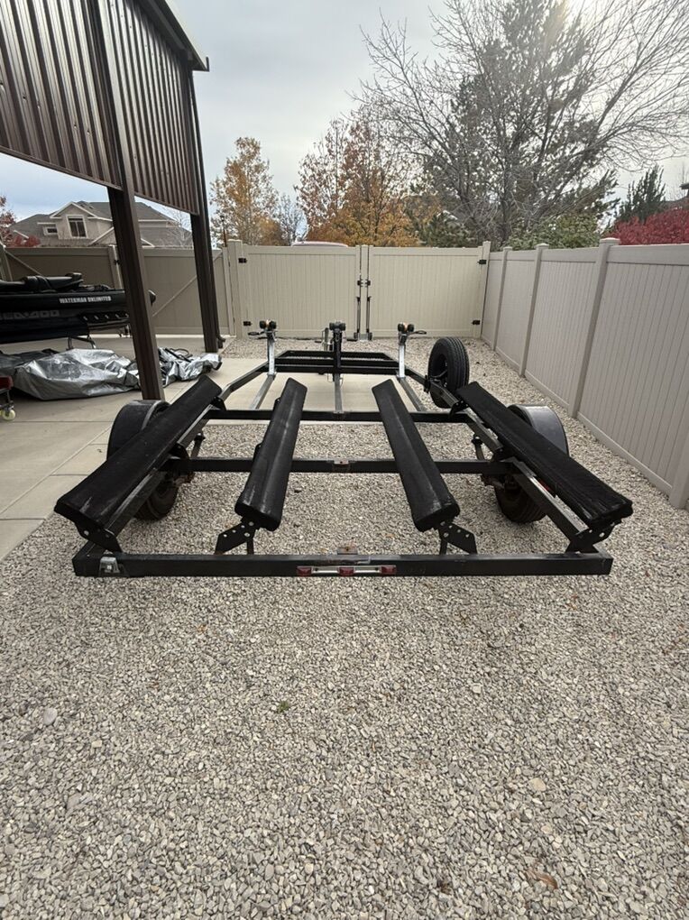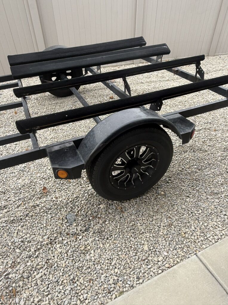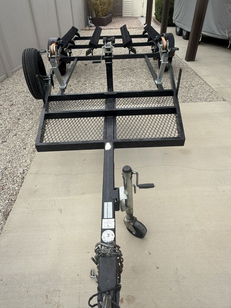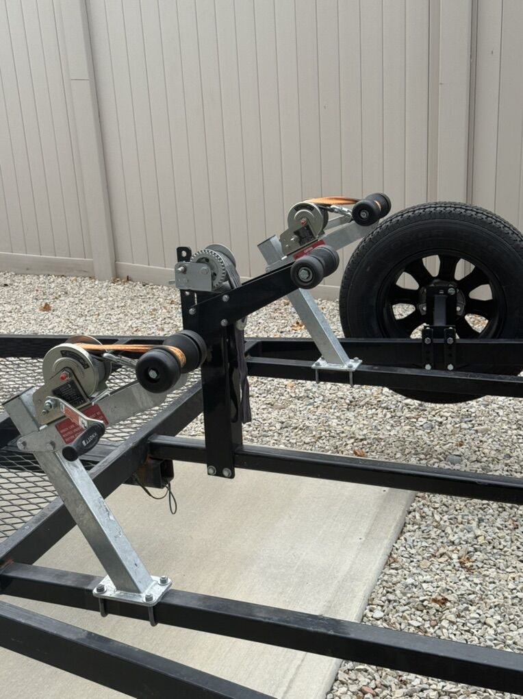 The trailer is a VOYAGER XL. Has new Raceline wheels including spare, new tires, new bearings and new bow crank. Bunks have been replaced last summer along with new carpet. Still have enough carpet left to redo the bunks again. Trailer is set up with 3 bow cranks to haul double or single loaded in the center.