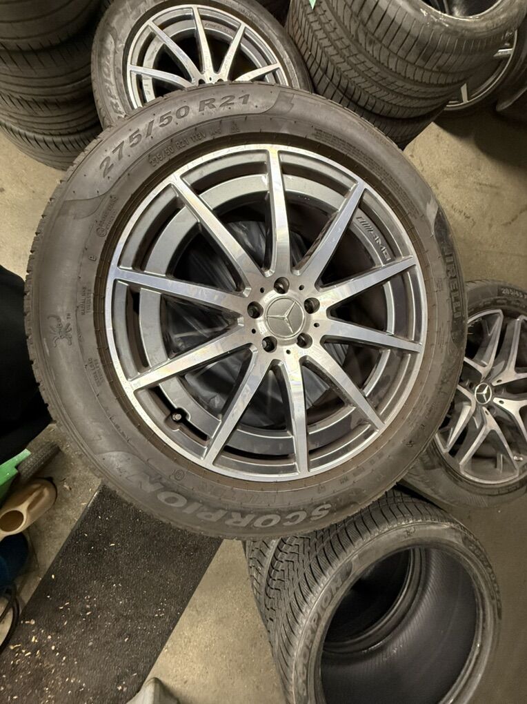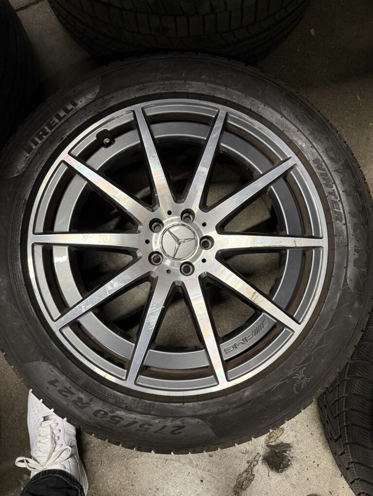 CashApp4 AMG 21” wheels that fit 275/50 R21 tires. Wheels do come with Pirelli Scorpion Winter tires that are currently on. Tires do not have much tread left. Can provide more pictures if needed.