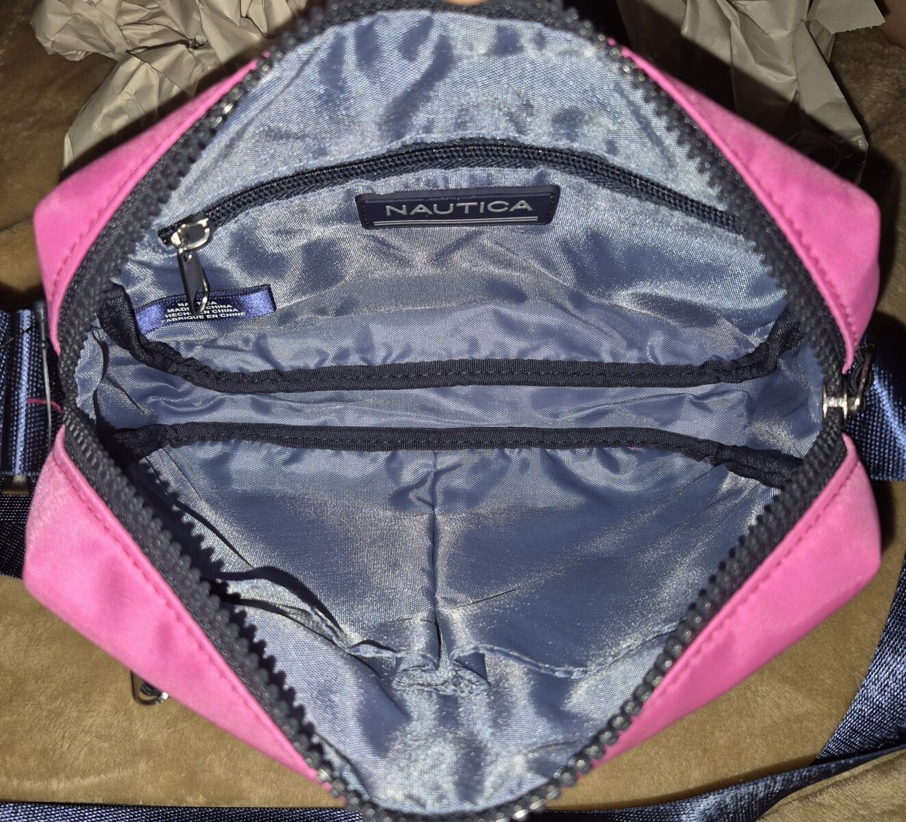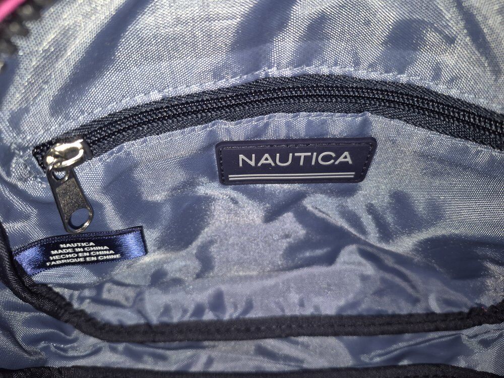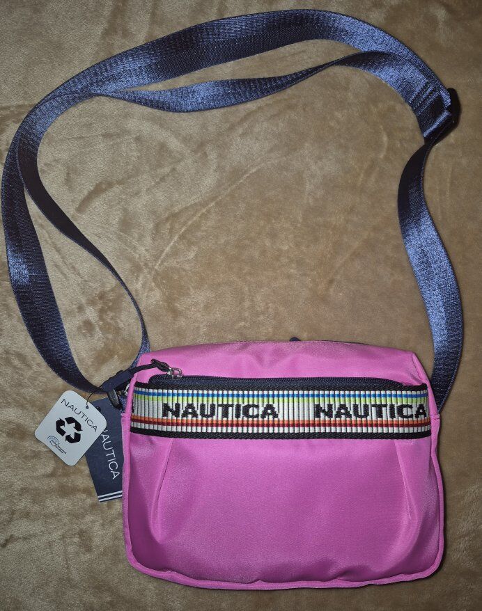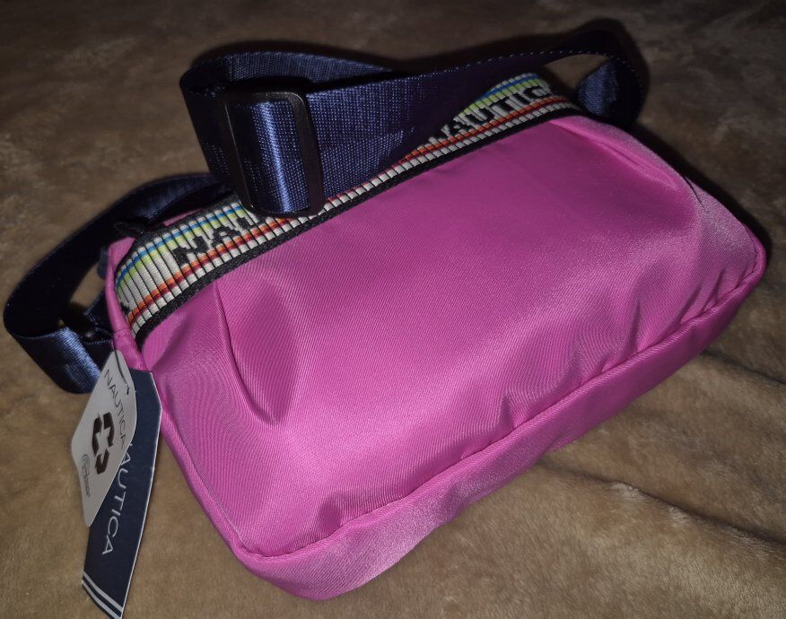 VenmoThe Nautica Rip Tide Signature Logo Camera Crossbody Bag in hot pink nylon is a stylish and functional accessory for women. With a backpack zip pocket, main compartment zip closure and adjustable crossbody strap, this small bag is perfect for on-the-go use. The pleats on the front pocket add a touch of flair, making it a trendy choice for everyday use. The hot pink exterior amd signature logo embroidered grosgrain trim make a bold statement, while the durable nylon material ensures long-lasting quality. The interior fabric of this product is made from 100% recycled plastic bottles. Two interior slide pockets and one zip pocket. 6.5x2.5x9 in, up to 26 in strap drop. New with Tags!