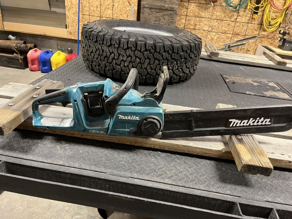 Only used two or three times! This is the 16” bar that takes two 18v batteries so you don’t have to get the 40v batteries. It works well for light cutting and I’ll throw in an extra chain too. Located in Ammon.