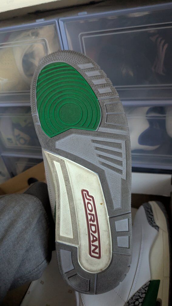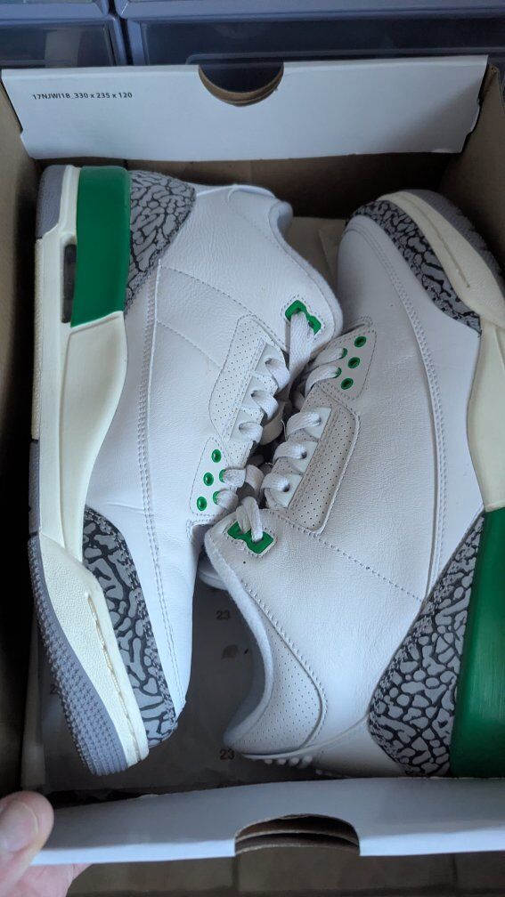 Zellehey how's it going putting these Jordan 3 women's release lucky green up for sale. they're a size 11.5 women's which is a size 10 in men's. I've only worn these maybe 5-10 times Max. I have about 60 pairs of shoes and stuff is in rotation. some stuff I just end up forgetting about and never wearing. this is one of them that have only worn a few times and have forgotten about so it's up for sale. I'm asking 180.00 and pickup is in Orem. I do work up in salt lake so if you want I can meet you in salt lake anytime between Tuesday and Saturday in South Jordan off of 7200, South and redwood. it'd be a better person you'll get on eBay or stockx. you'll also have to pay shipping and taxes and wait for the shipping to arrive to you and legit check. this is all legit. I have all the receipts and electronic stamps to show that I bought them from sneakers app