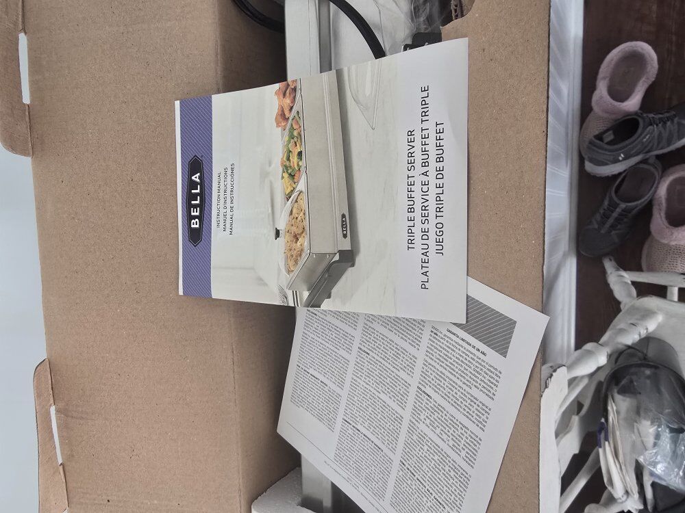 PayPalThis is a Bella Triple Buffet Server & Warming Tray. It is a stainless steel electric buffet server with three 1.5-quart chafing dishes, each with a clear dome lid. The base can also be used as a standalone warming tray. It has adjustable temperature controls to keep food warm for parties and gatherings. The unit has cool-touch handles for safe transport.