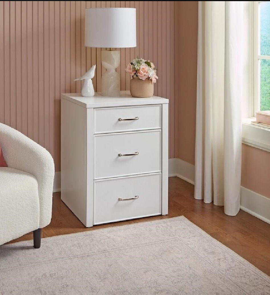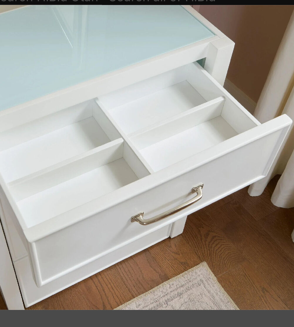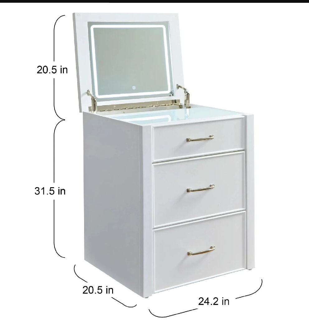 White painted vanity crafted from durable rubberwood solids. Features two drawers with English dovetail construction for sturdy storage. Includes a lift-up mirror with built-in LED lighting offering 3 cool and 3 warm settings. The coordinating stool conveniently tucks away beneath the vanity for space-saving storage. Dimensions: 24.2 in. W x 20.5 in. L x 31.5 in. H