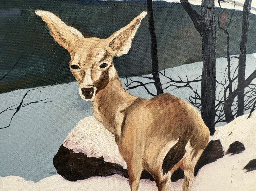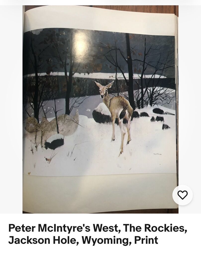 I have a painting of a deer in a rustic frame. This painting is shown in a book called West. It shows paintings that Peter McIntyre did when he visited the United States and specifically Jackson Hole, Wyoming (see the pictures for a print in the book). This painting is not signed so I’m assuming it’s someone else’s reproduction. That’s why it’s not priced as a McIntyre painting. The frame is 24 3/4 inches wide and 20 3/4 inches tall. It has picture wire on the back for hanging. The last 6 pictures are other artwork that I have listed on KSL. See my other ads for jewelry, artwork, home decor and more.
