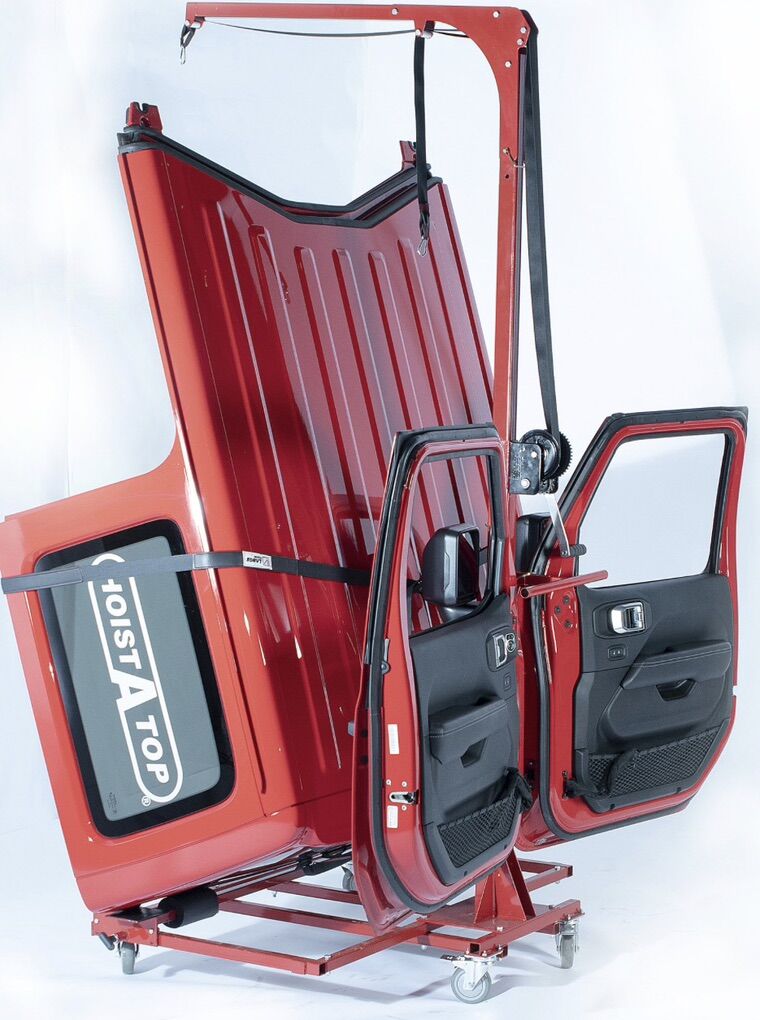 The new Hoist-A-Cart™ Gen 2 from Lange Originals® makes it possible for one person to remove, lower, and store their top on the cart, and wheel their top and doors anywhere for storage. Rugged construction, a strong steel frame, heavy-duty swivel casters, and a geared winch, lifts, lowers, and stores your top. The cart footprint is small enough to fit in the corner of either a garage, a storage shed, or a carport. The base includes 1 set of built-in door hangers. Foam and rubber coatings keep your top and doors in pristine condition. The Hoist-A-Cart™ Gen 2 makes going topless easier than ever.