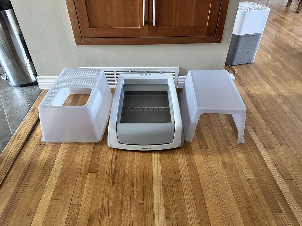 VenmoPet Safe Self Cleaning Litter Box with top entry cover (paid $229), extra front entry cover ($35 new), and reusable tray ($47 new).