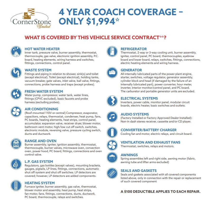 Extended Service Contracts are available with purchase. You can add 100,000 additional miles of powertrain coverage or 4 years of coverage for the appliances and systems of the coach. They have a simple $100 deductible and can be used virtually anywhere. Contracts are both transferable and can be canceled any time for a refund. Contact TOM for details.