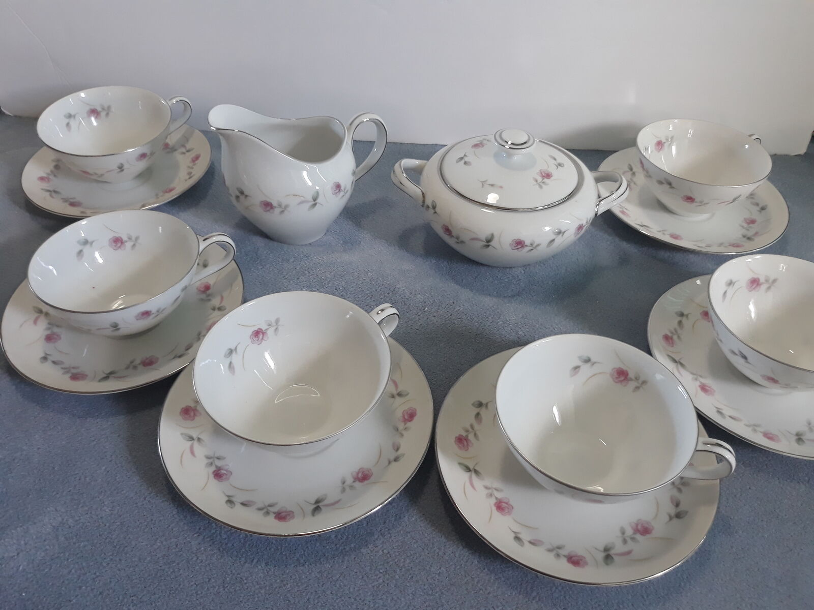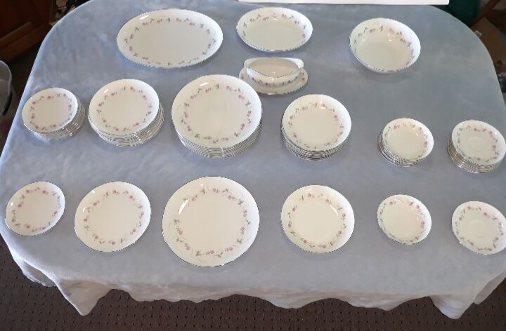 This is a lovely set of Sone China which was made in Japan. There is a complete service for six although there are 7 to 8 of most things. There is also a gravy boat, oval platter, and round and oval serving bowls. There are teacups and saucers along with cream and sugar dishes. This is from The Rose Lane collection. This pattern has pretty pink flowers with grayish green leaves. phone calls or texts please. Cash only. Thanks for looking!