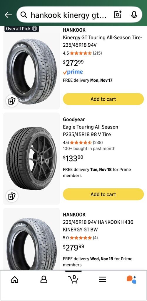 VenmoHankook Kinergy GT Touring All-Season Tire-235/45R18 in great condition still with about 80+% life on them Retail price for this tires goes close to $1000 plus tax etc.