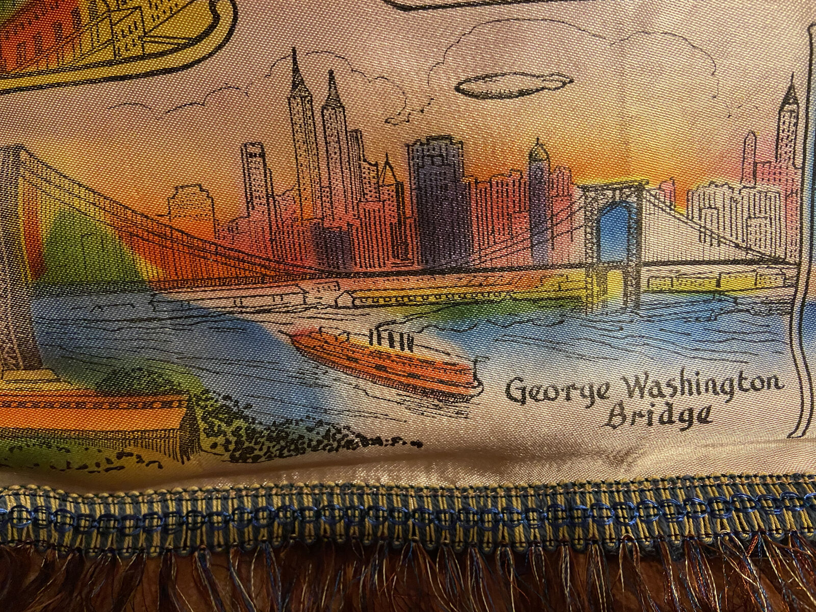 Vintage souvenir item, made of silk or satin with a fringed edge.