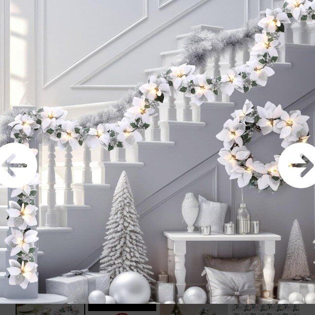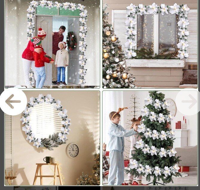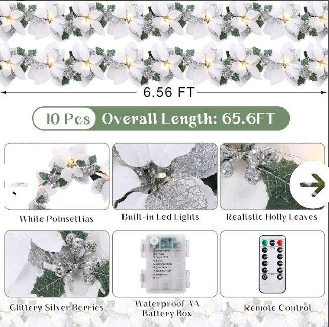 Christmas Festive Ambiance: This lighted poinsettias and holly leaves garland is decorated with red glitter berries, holly leaves, and red poinsettia flowers, and each piece is equipped with an LED lights string containing 10 lights, it will help you to create a vibrant holiday atmosphere, adding a warm and welcoming glow to your home for this Christmas holiday 8 Modes and Timer Function: Comes with two remote controls with 8 lighting modes and a timer function, this lighted poinsettia garland set allows you to turn on/off the lights, set the timer, shift the lighting modes or adjust the brightness without leaving your seat, and in timer mode, the light turns on for 6 hours and turns off for 18 hours Batteries Powered and Pre-assembled: Designed with convenience in mind, the artificial poinsettia garland is equipped with pre-assembled light strings and is powered by battery (not included), allowing flexible placement without the need for outlets, and you can reuse it each season by reshaping it for other displays