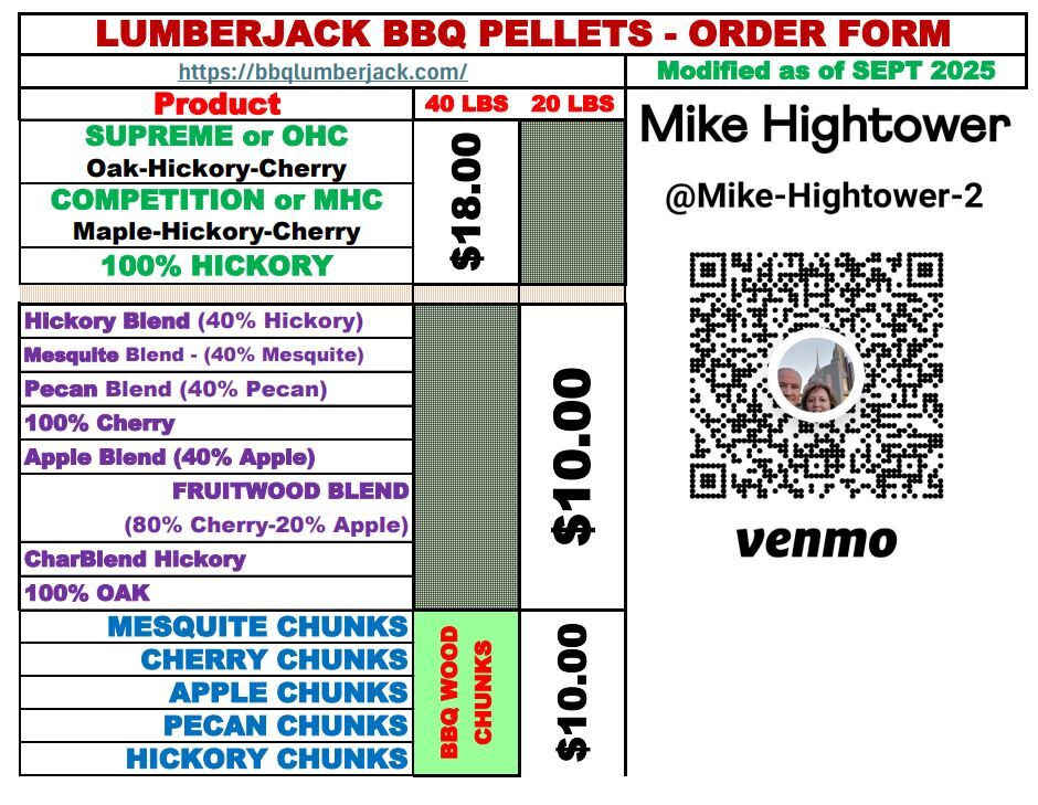 I also have Lumberjack Smoking CHUNKS in 4lb bags for $10 each. These are brand new to the Brand, coming in 5 flavors, and are very good for those of you that smoke with real wood chunks to be used on your BBQ. They come in Cherry, Pecan, Hickory, Mesquite, and Apple. - These Chunks are amazing to add a depth and color to your BBQ. Elevate your barbeque with these CHUNKS to deliver consistent, long lasting smoke for rich, authentic flavor. See this link for the brand link: - https://bbqlumberjack.com/collections/bbq-wood-chunks
