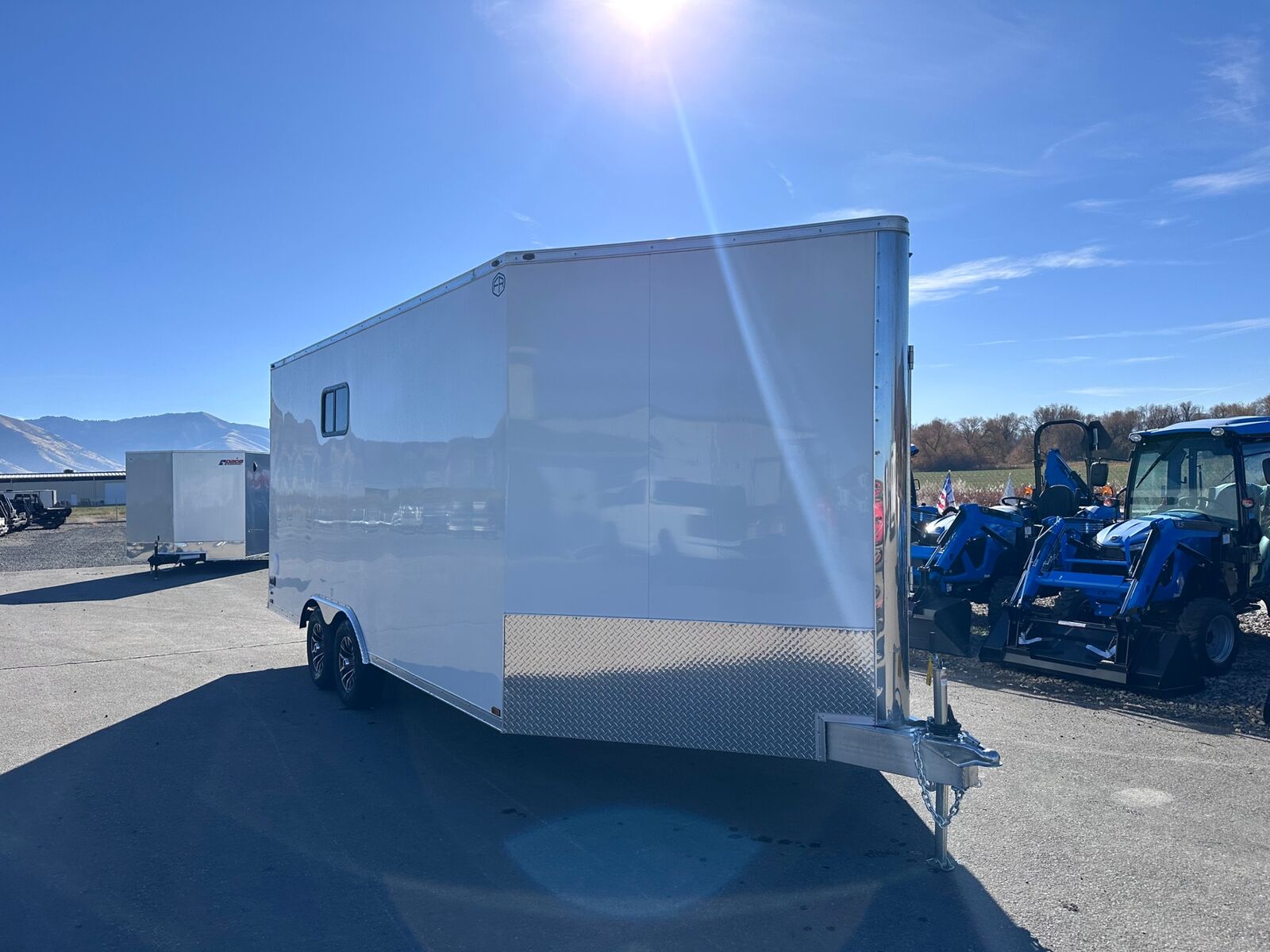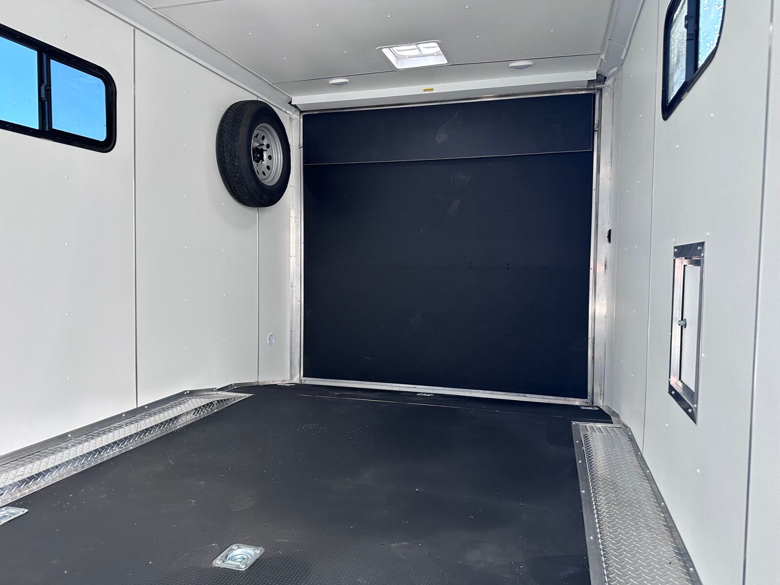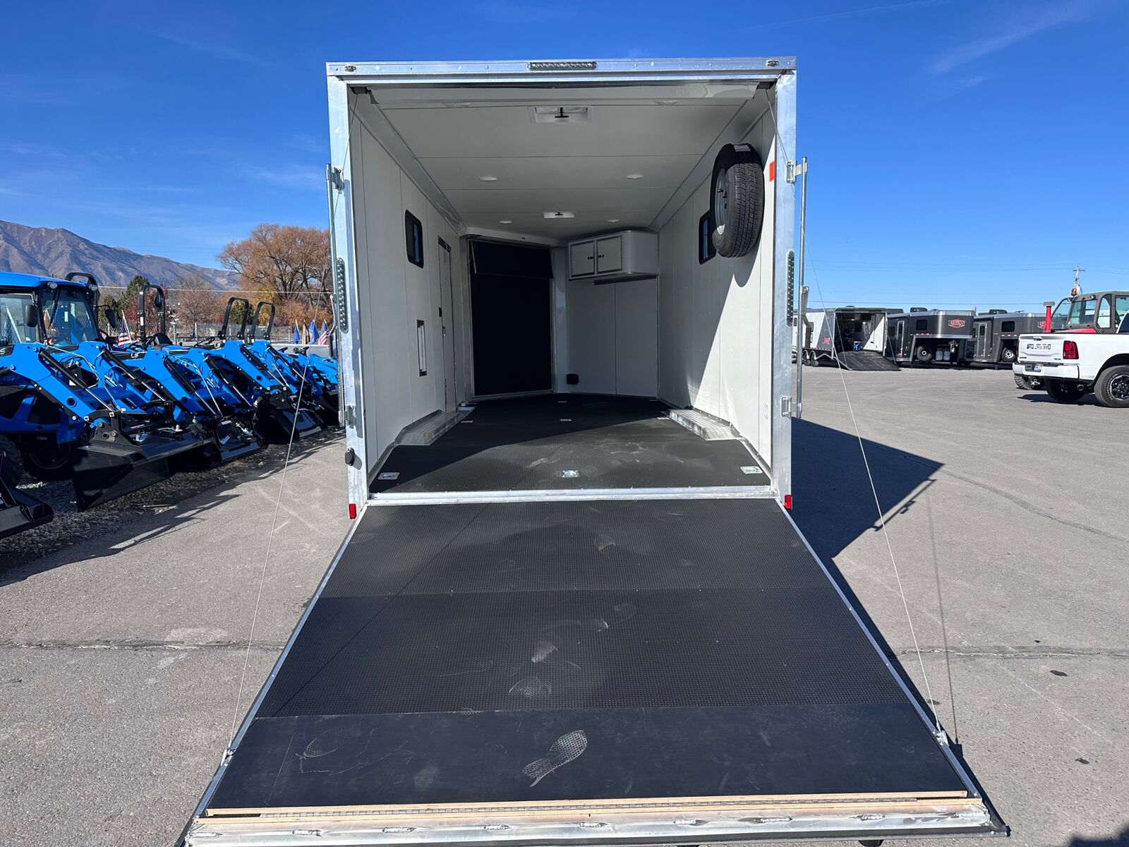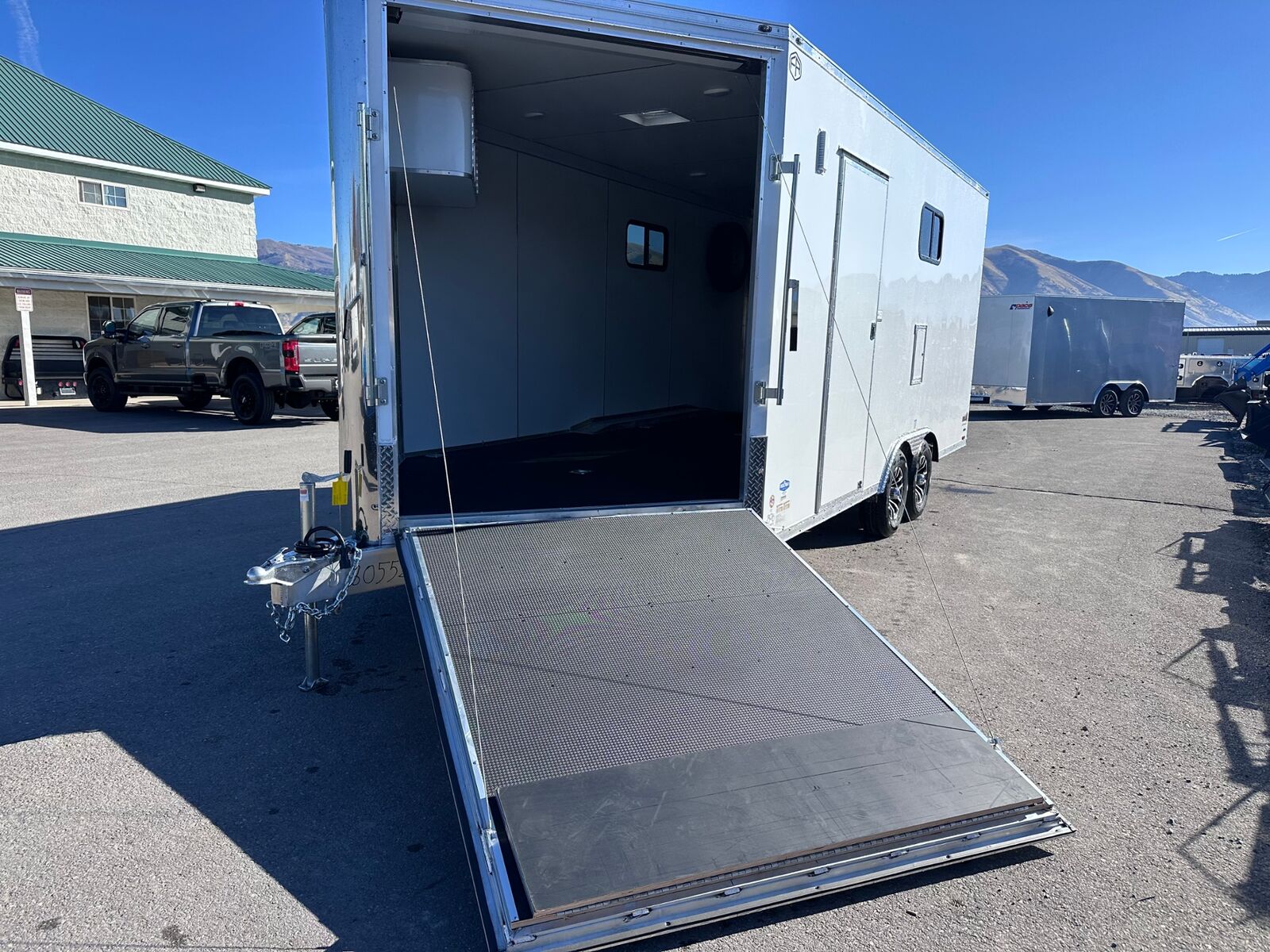 18' Box 5' V-nose Front and Rear Ramp Doors 5K Torsion Axles All Aluminum Frame White Walls and Ceiling Insulated Walls and Ceiling Poly Bead Flooring Windows Front Cabinet 9 D-Rings in Floor Drive Over Fenders Spare Tire and Wall Mount