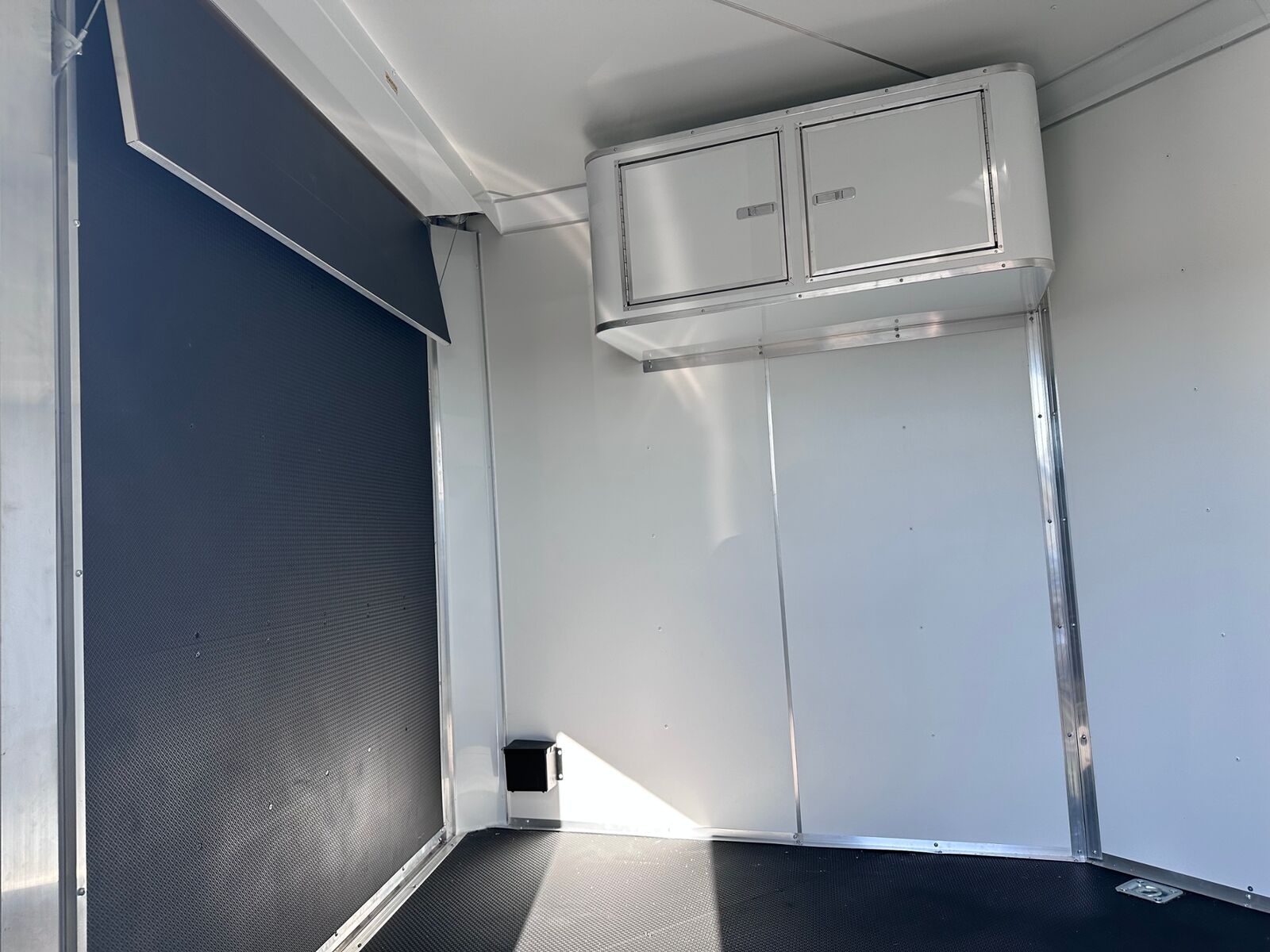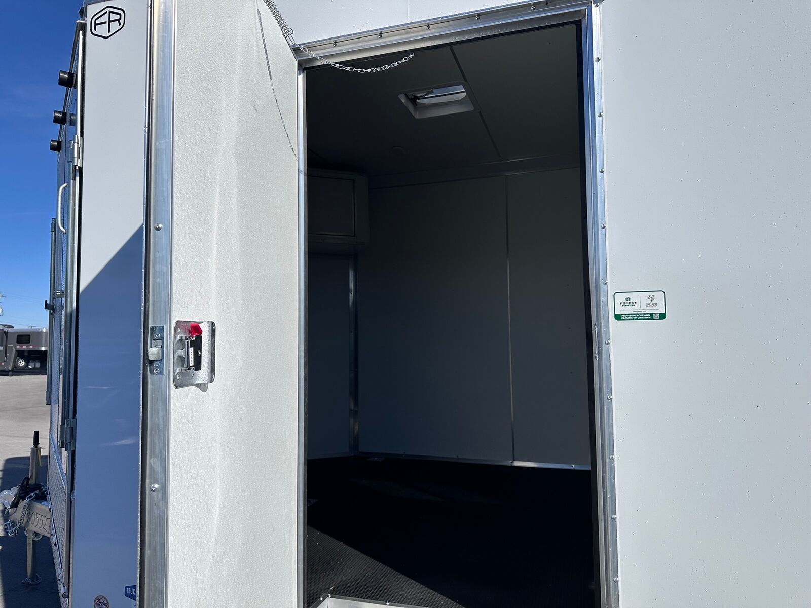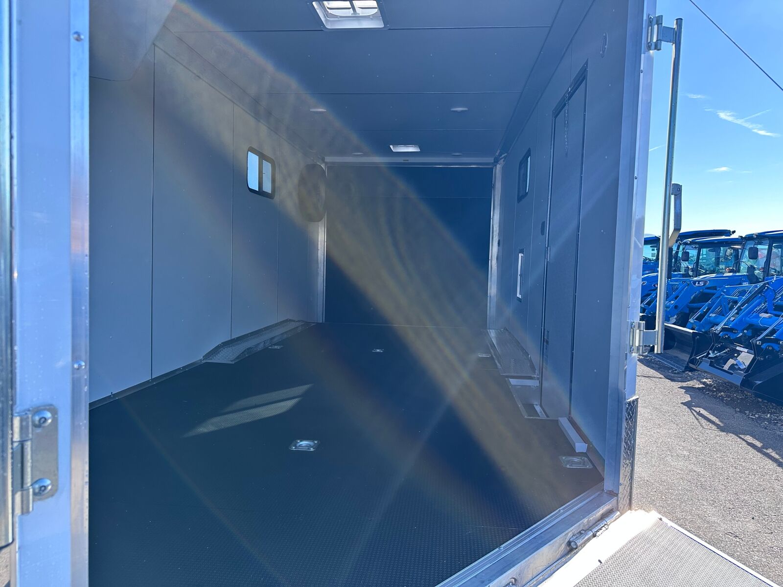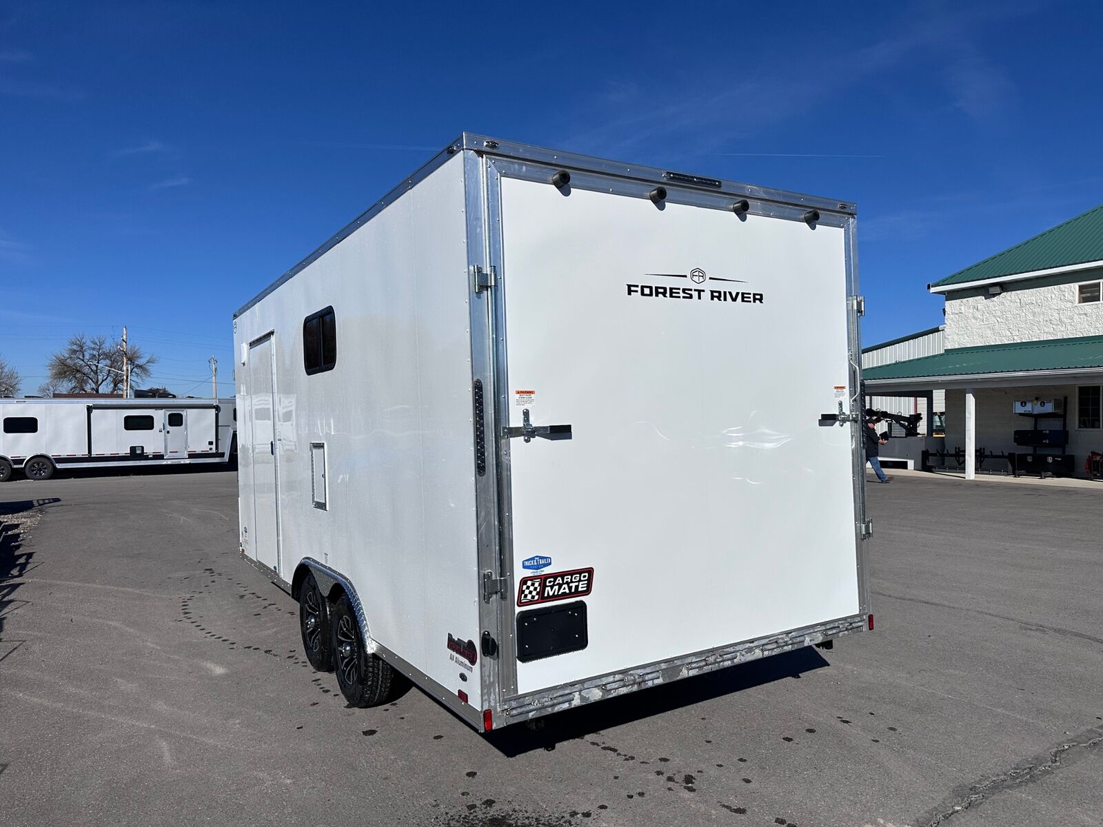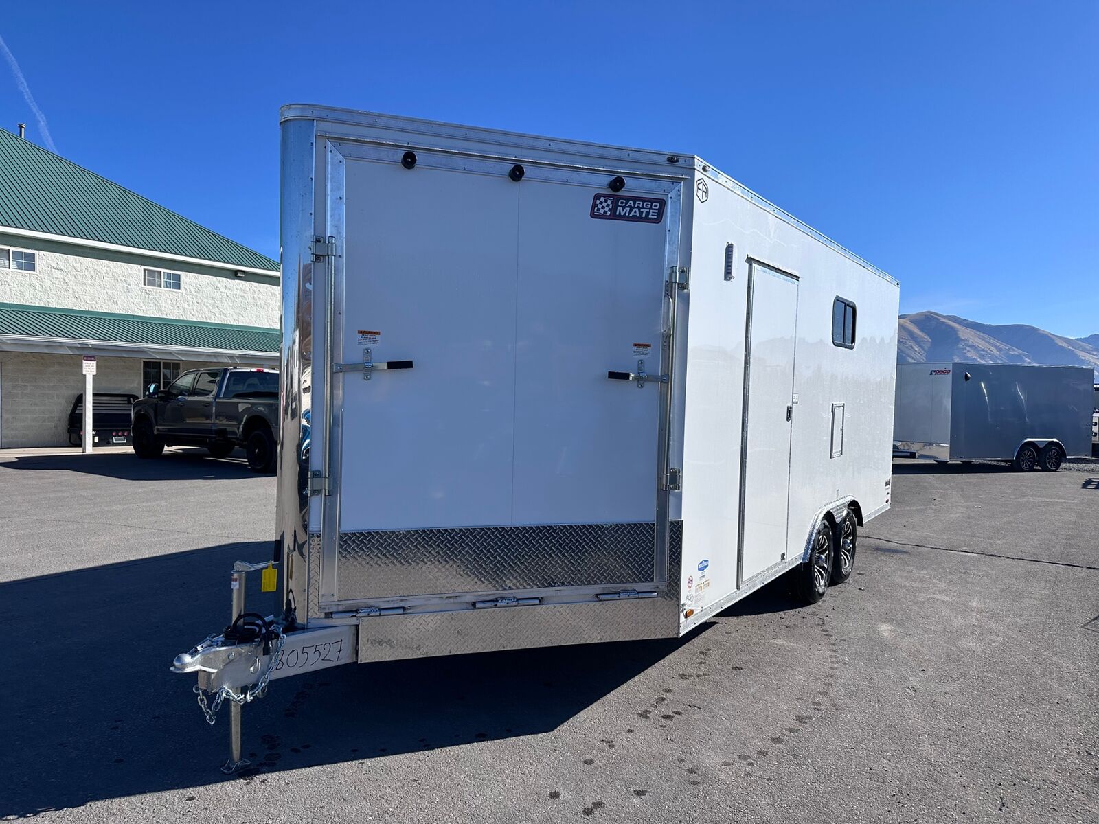 18' Box 5' V-nose Front and Rear Ramp Doors 5K Torsion Axles All Aluminum Frame White Walls and Ceiling Insulated Walls and Ceiling Poly Bead Flooring Windows Front Cabinet 9 D-Rings in Floor Drive Over Fenders Spare Tire and Wall Mount