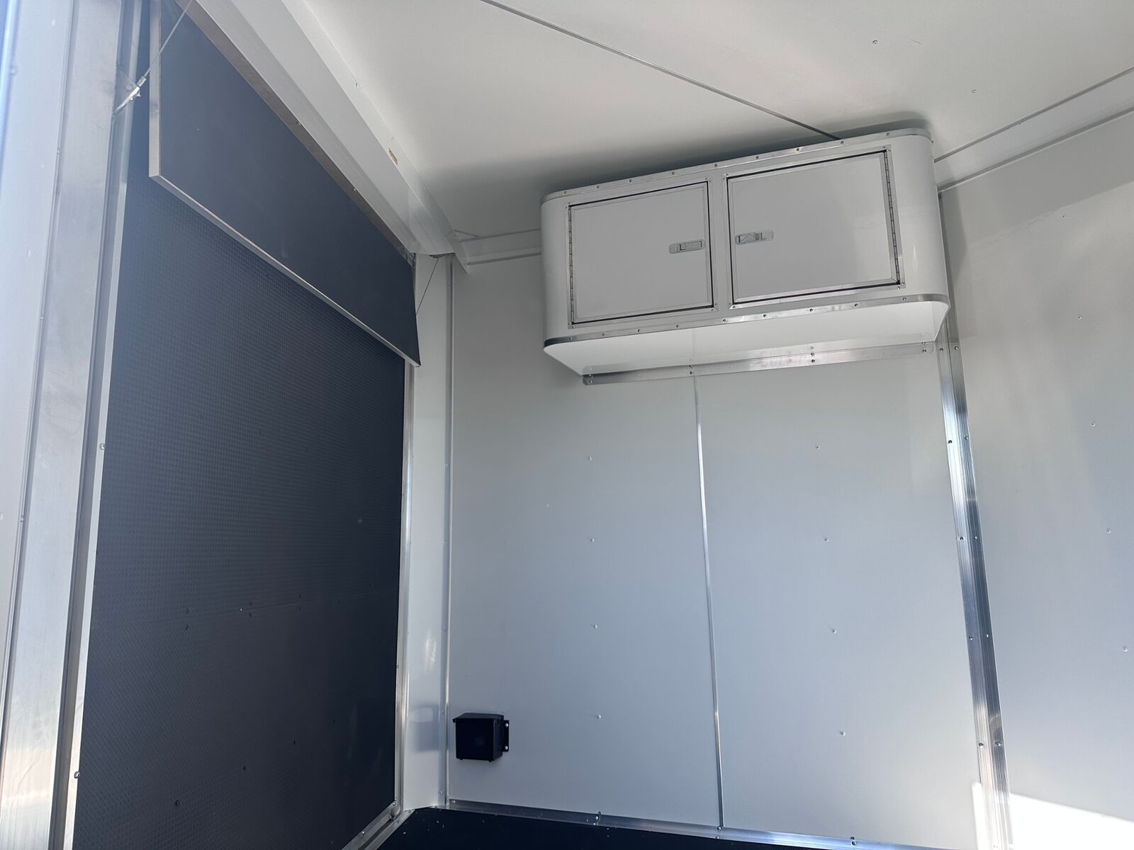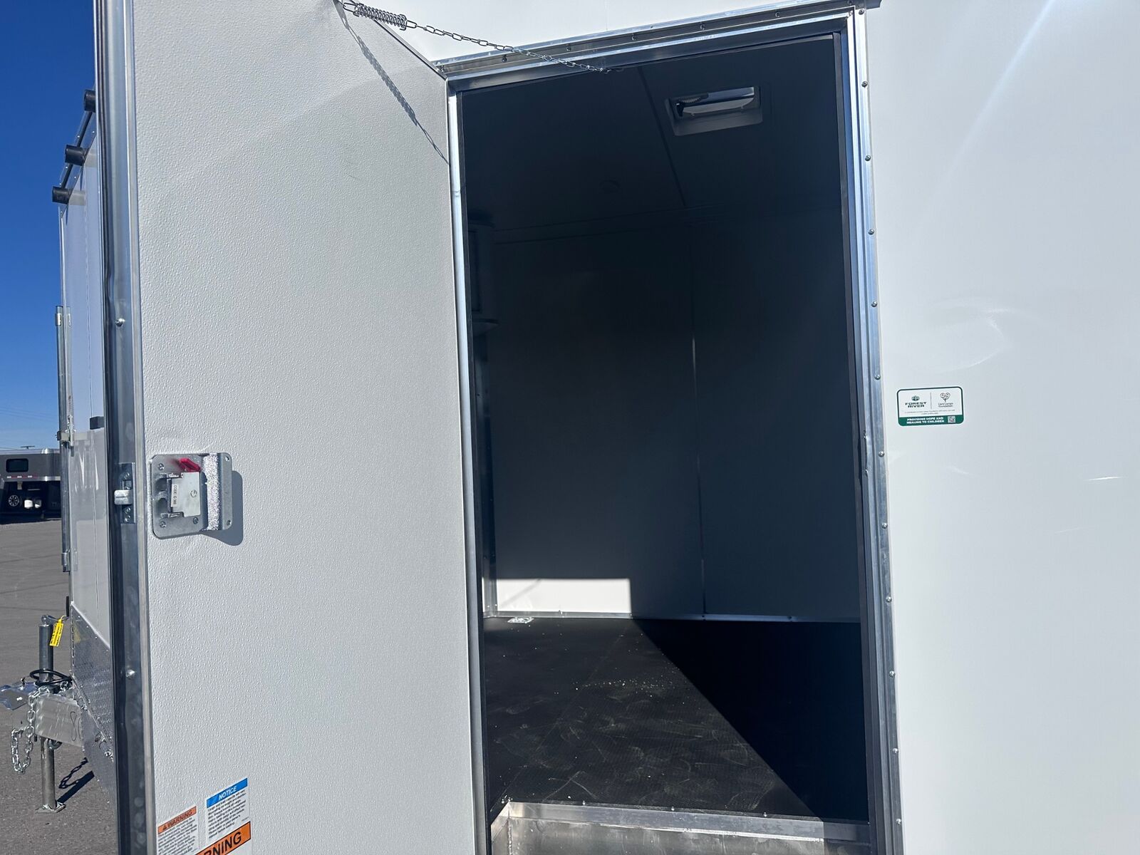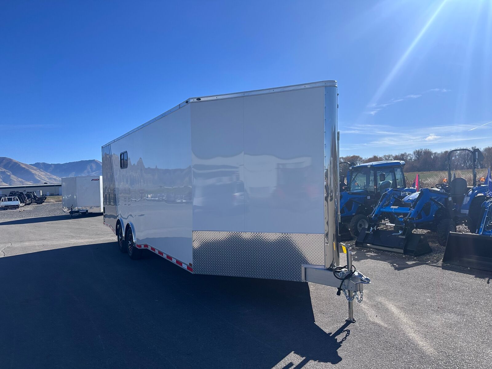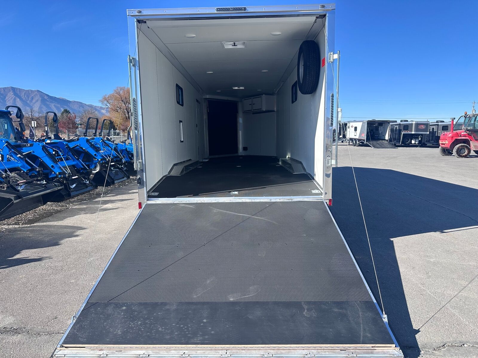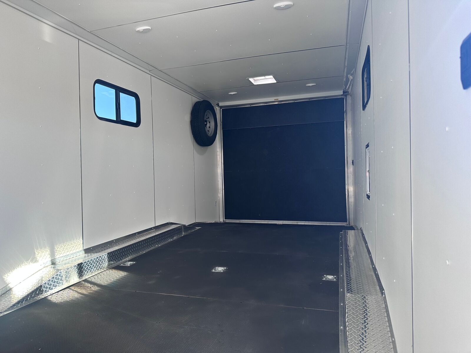 24' Box 5' V-nose Front and Rear Ramp Doors 6K Torsion Spread Axles All Aluminum Frame White Walls and Ceiling Insulated Walls and Ceiling Poly Bead Flooring Windows Front Cabinet 9 D-Rings in Floor Drive Over Fenders Spare Tire and Wall Mount