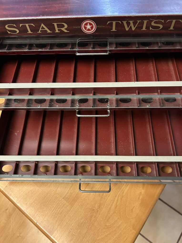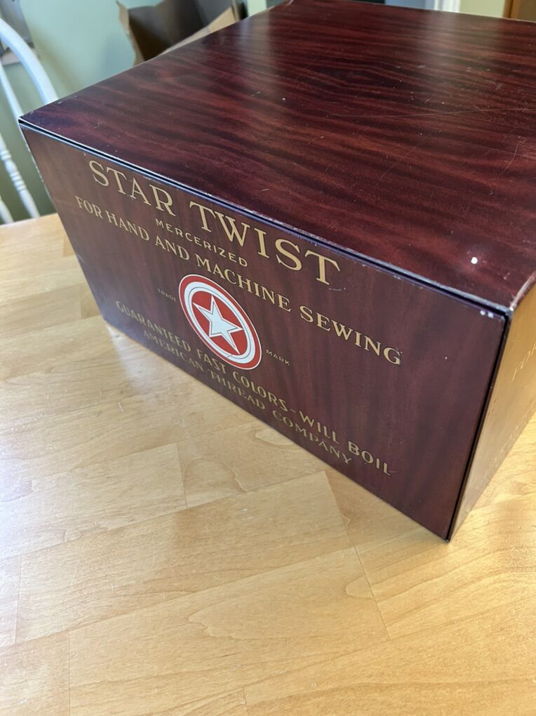 Great thread storage cabinet for sewing thread. Great graphics and in good working order. Made of metal with four drawers.