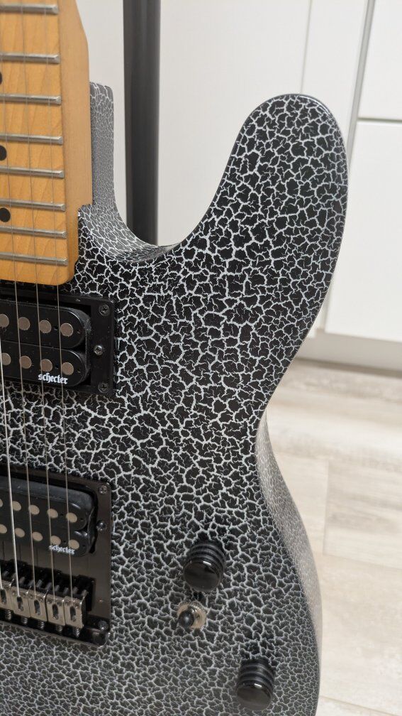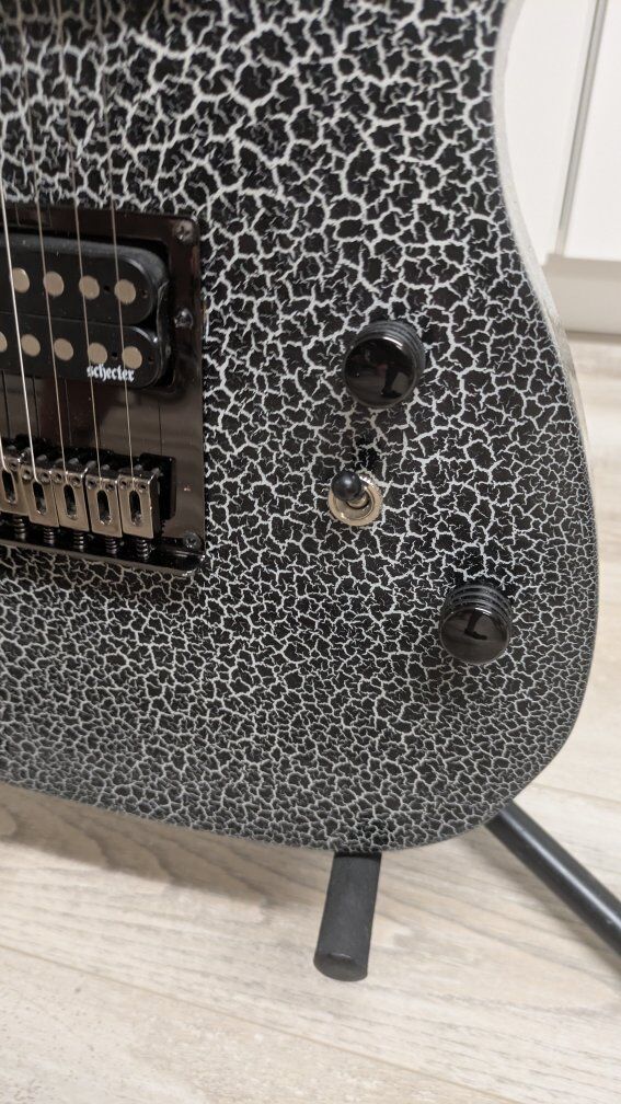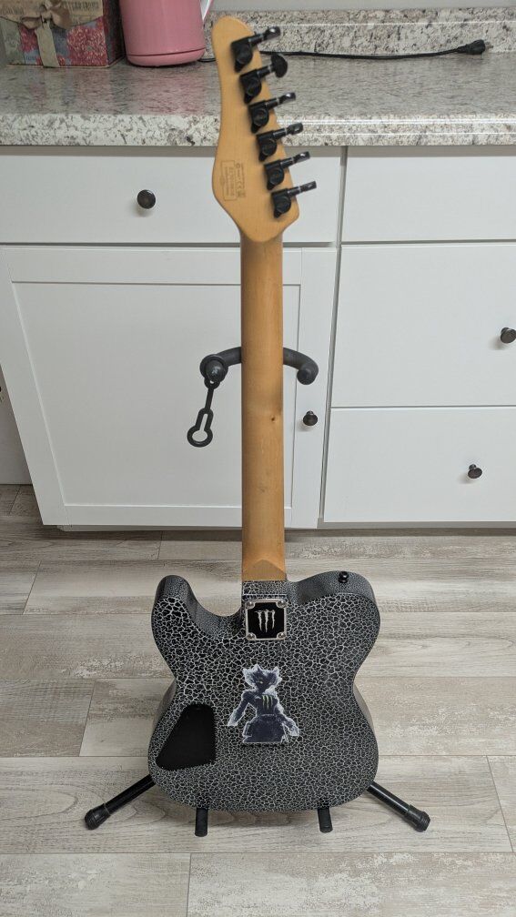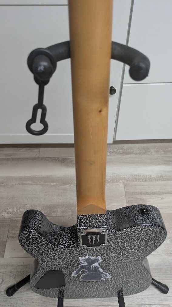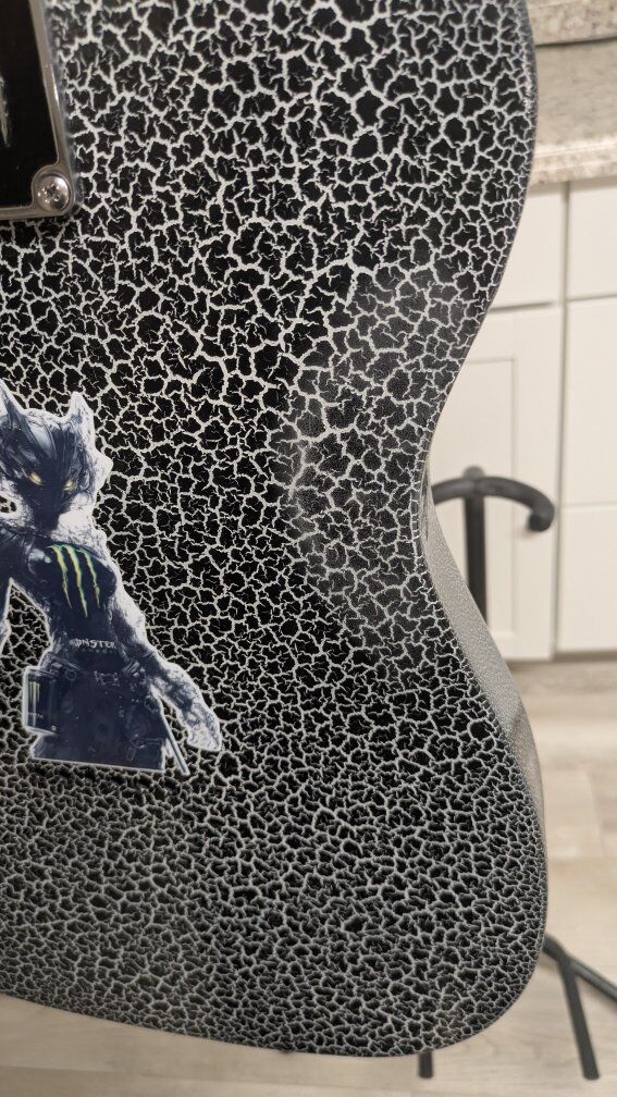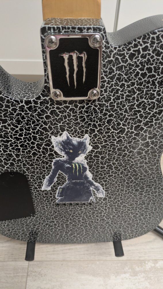 So I got this guitar a while back. stock from the factory, I think they're just fugly. The flat black is okay but the big green corporate monster logo on the front of it is just an eyesore. I wanted to keep it monster themed but roll it back a little bit. gave it a nice crackle paint job, put on a new bridge cuz the old one was all scratched up and did a two-part epoxy clear coat so it's hard as a rock And has a great gloss shine to it. the paint is perfect. the clear coat, not bad. it's got a couple of little boogers on it but it's on the back and the bottom side so you don't even see it on the top. I wanted to find the coolest monster decal I could and when I saw her I knew she was the one. everything else is stock on it. It's set up and ready to play. definitely an eye catcher. I don't have a case for it.