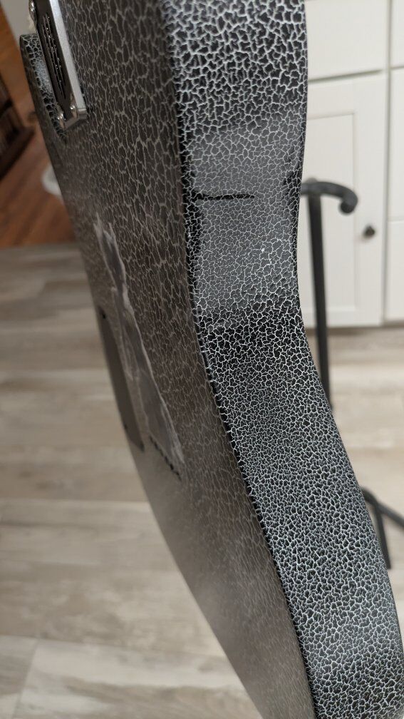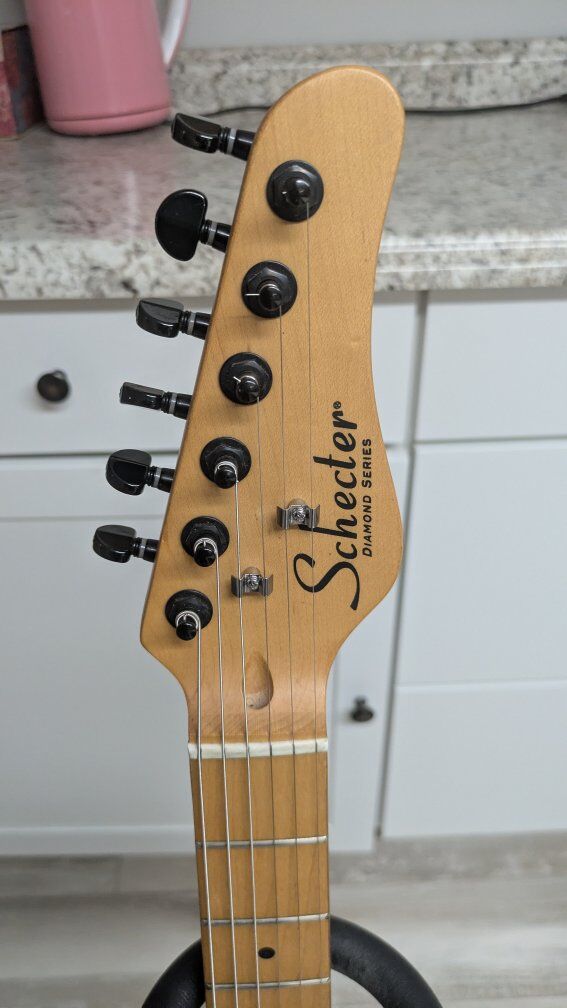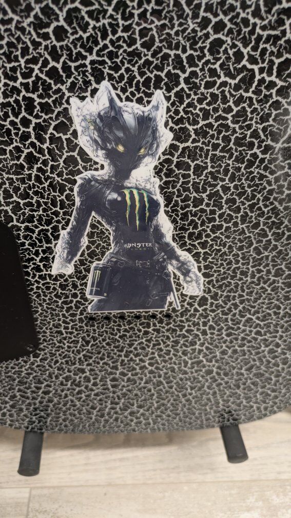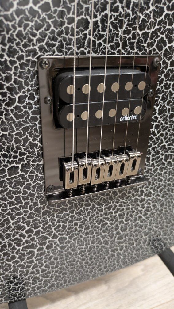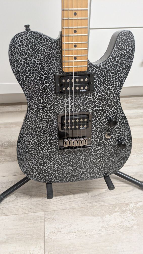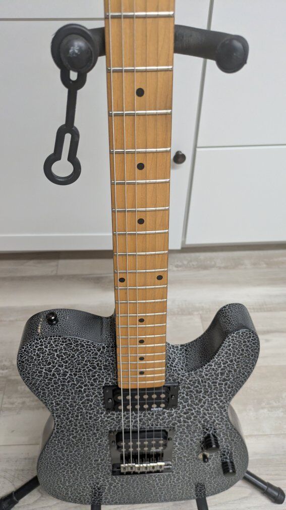 So I got this guitar a while back. stock from the factory, I think they're just fugly. The flat black is okay but the big green corporate monster logo on the front of it is just an eyesore. I wanted to keep it monster themed but roll it back a little bit. gave it a nice crackle paint job, put on a new bridge cuz the old one was all scratched up and did a two-part epoxy clear coat so it's hard as a rock And has a great gloss shine to it. the paint is perfect. the clear coat, not bad. it's got a couple of little boogers on it but it's on the back and the bottom side so you don't even see it on the top. I wanted to find the coolest monster decal I could and when I saw her I knew she was the one. everything else is stock on it. It's set up and ready to play. definitely an eye catcher. I don't have a case for it.