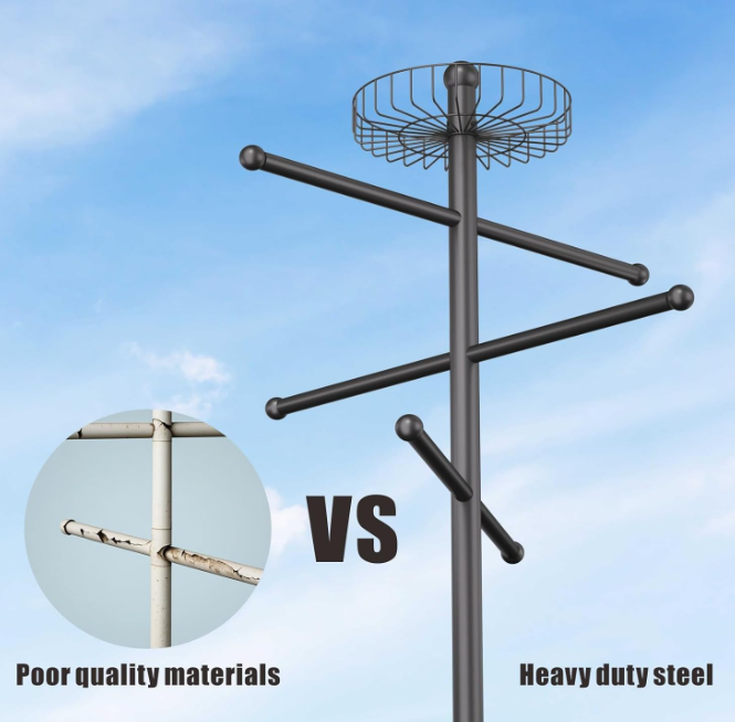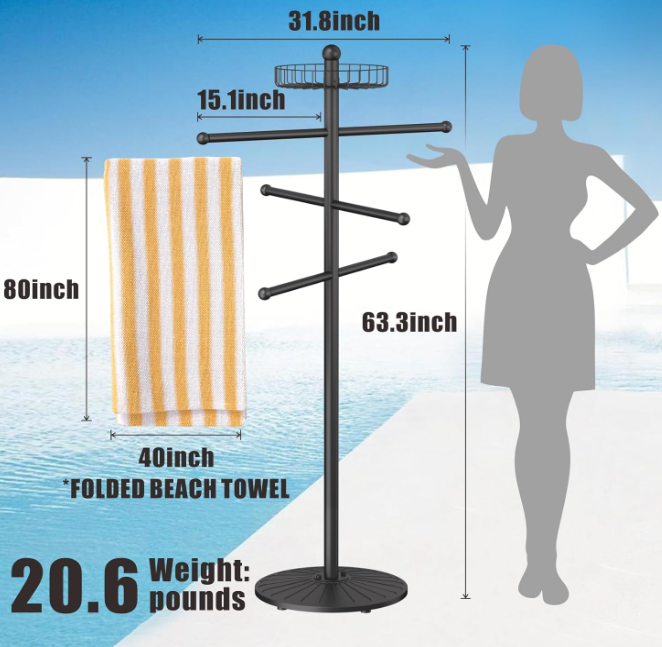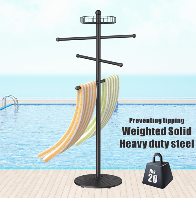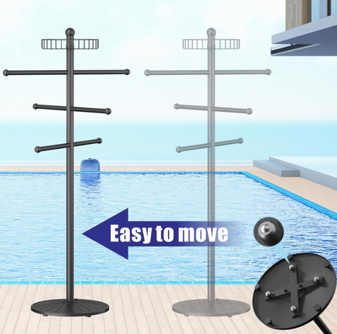[Commercial grade rust protection]: 20lb steel frame with double-layer heavy-duty anti-rust coating withstands poolside/humid bathroom challenges. Reinforced tubing walls are 2x stronger than standard racks, resisting bending and wobbling in windy conditions.