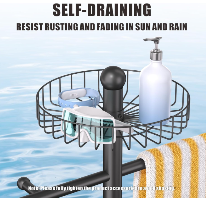 [Professional Grade Storage System]: The 3-tier staggered bar storage rack holds up to 12 towels without overlapping.11.8” rust-resistant storage baskets hold up to 20 pounds of pool essentials.30° smart angle prevents slipping.