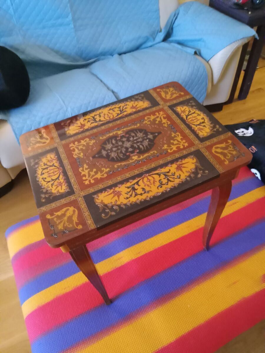 75 obo. Lovely Romantic Inlaid Wood Musical Jewelry Box or Side Table with curved legs! Top opens to reveal compartments for jewlery or other treasures. (16"Wx17"H) The item is a wind up musical box but currently the music does not play. If you fix things this might be a great deal! In Cottonwood Heights / Cash only