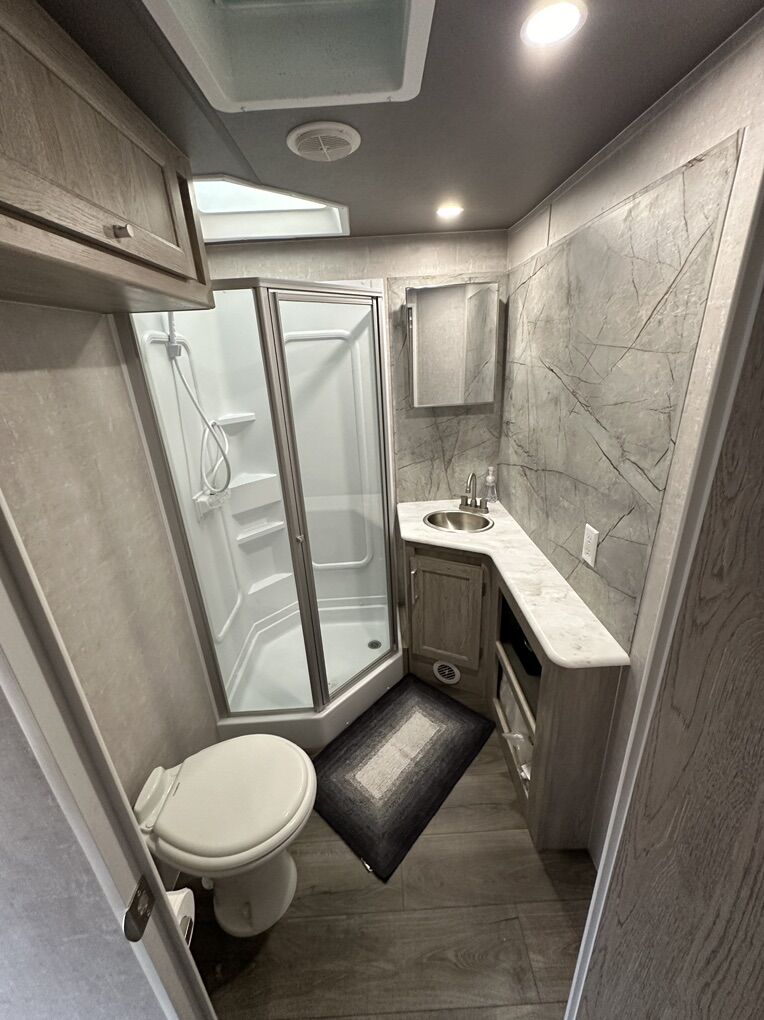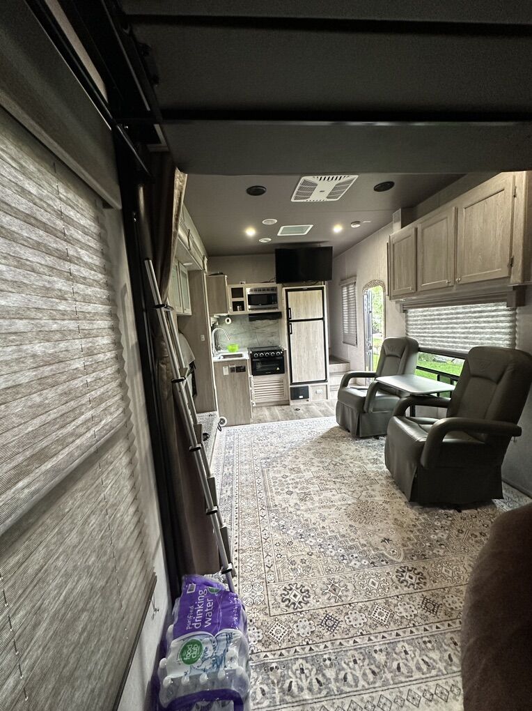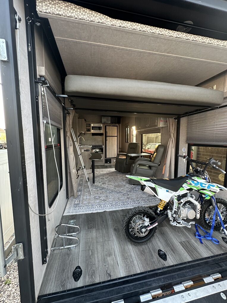 Solar 2 AC units Fits rzr 4 and two dirt-bikes. RV Type Fifth Wheel Toy Hauler Length 31 ft (Overall length is 32 ft 9 in per some listings) Exterior Width 8 ft 6 in Exterior Height 13 ft Dry Weight 9,550 lbs Gross Vehicle Weight Rating (GVWR) 14,000 lbs Cargo Carrying Capacity Approximately 3,000 lbs Sleeping Capacity Up to 8 people Fresh Water Capacity 150 gal Gray Water Capacity 50 gal Black Water Capacity 50 gal Fuel Tank Capacity 40 gal (for toys) Generator Onan 4.0kW or 5.5kW generator with transfer switch (often standard or a common option) A/C Dual units (13,500 & 15,000 BTU) Garage Size 15 ft 6 in