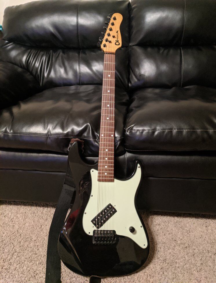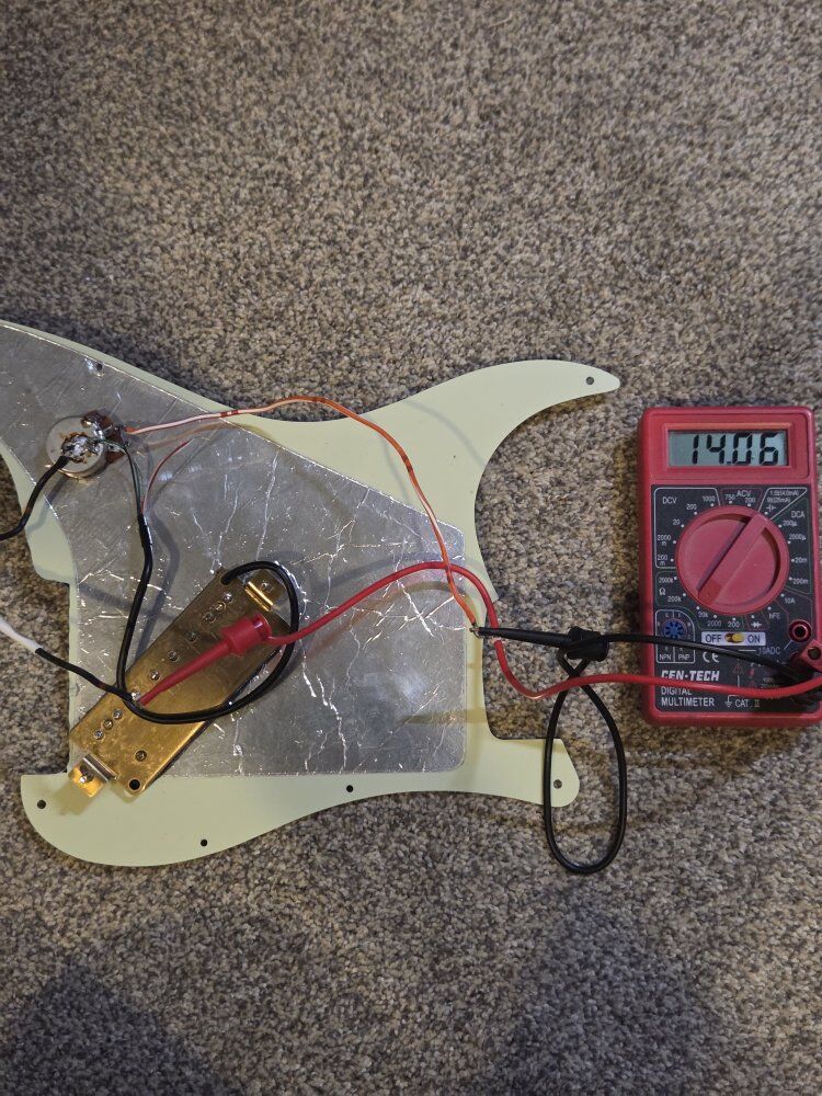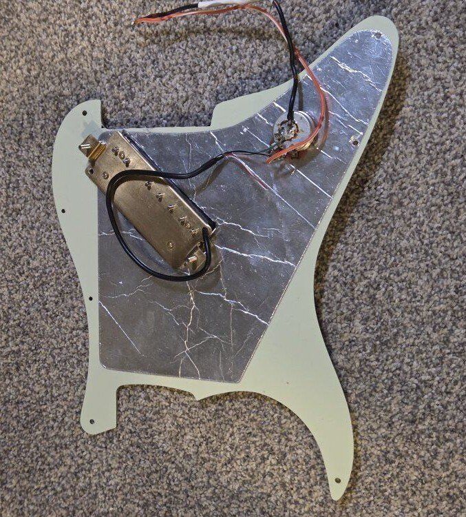 Be unique with this custom pick guard. It has a generic 8 string pickup (14.06k) mounted on a slant in the Jake E Lee style to give you big chugs and more open high notes.