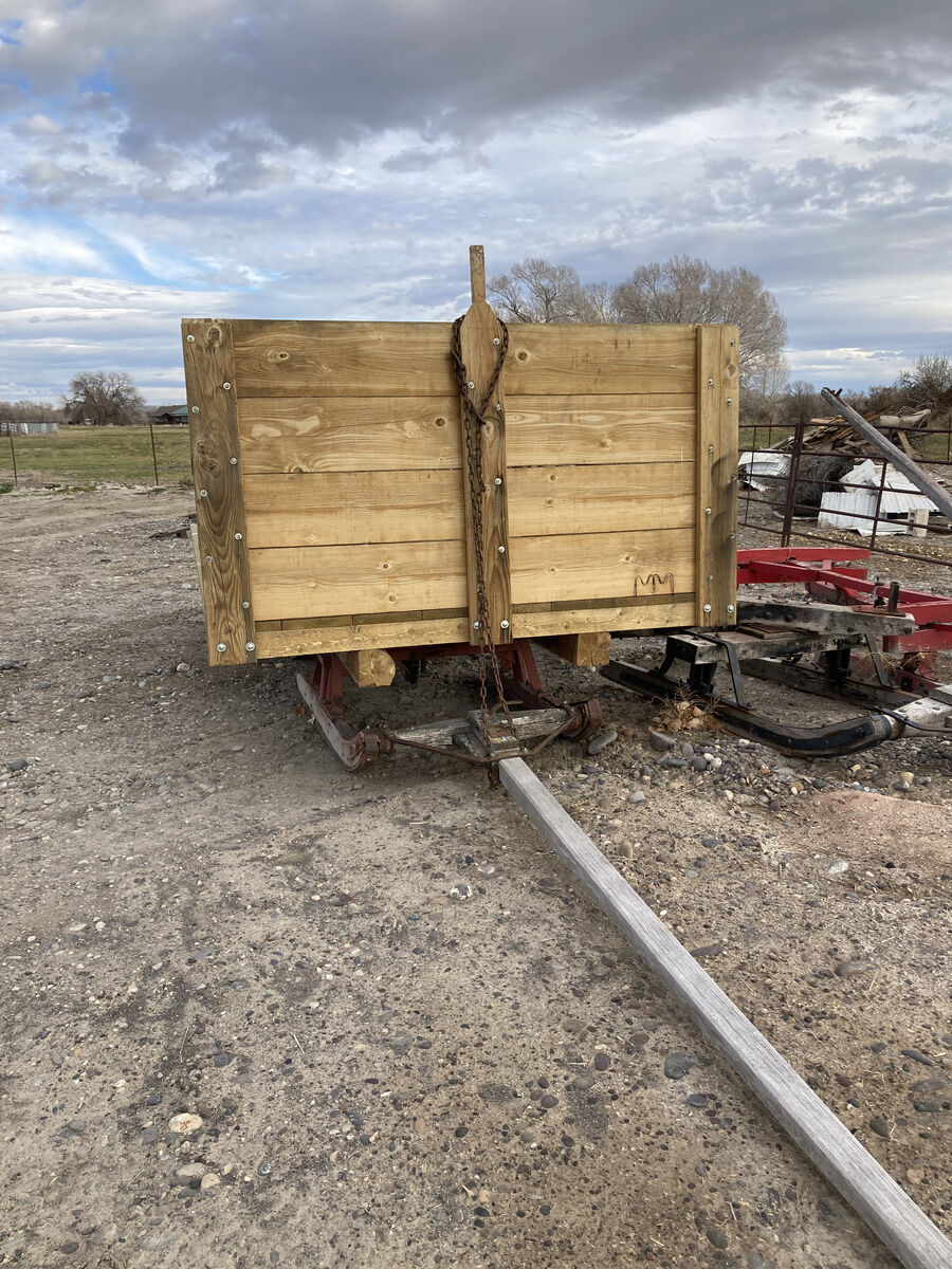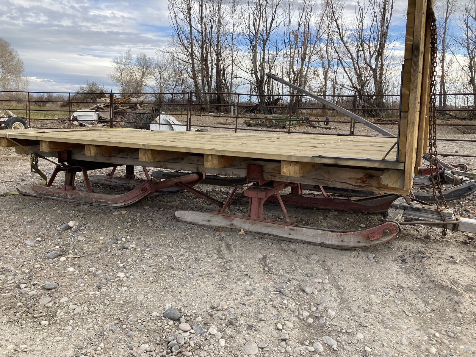VenmoFeed Sleigh, 8ft by 16ft, new 2by 12 bed 44 in front, bed secured to 4by5 cross stringers with 3/8ths bolts on 6x6 main stringers, with good bobs, draft tongue.