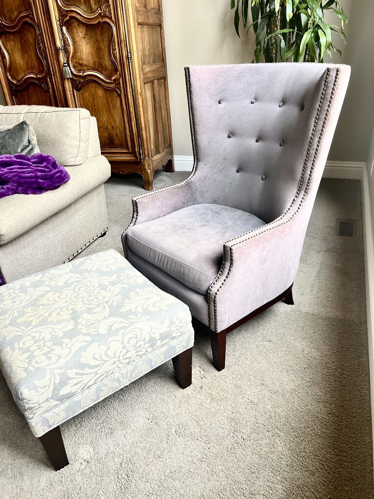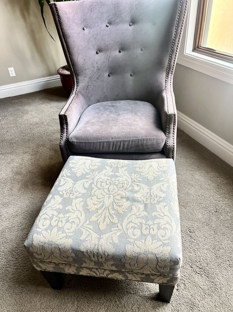 VenmoModern WingBack Chair & Ottoman $350 BOTH Pick up in Sandy 44”H 34”W top 36”D overall 28”W at the arms Seat 18”H 22”D 24”W Grey velvet bronze nailhead trim