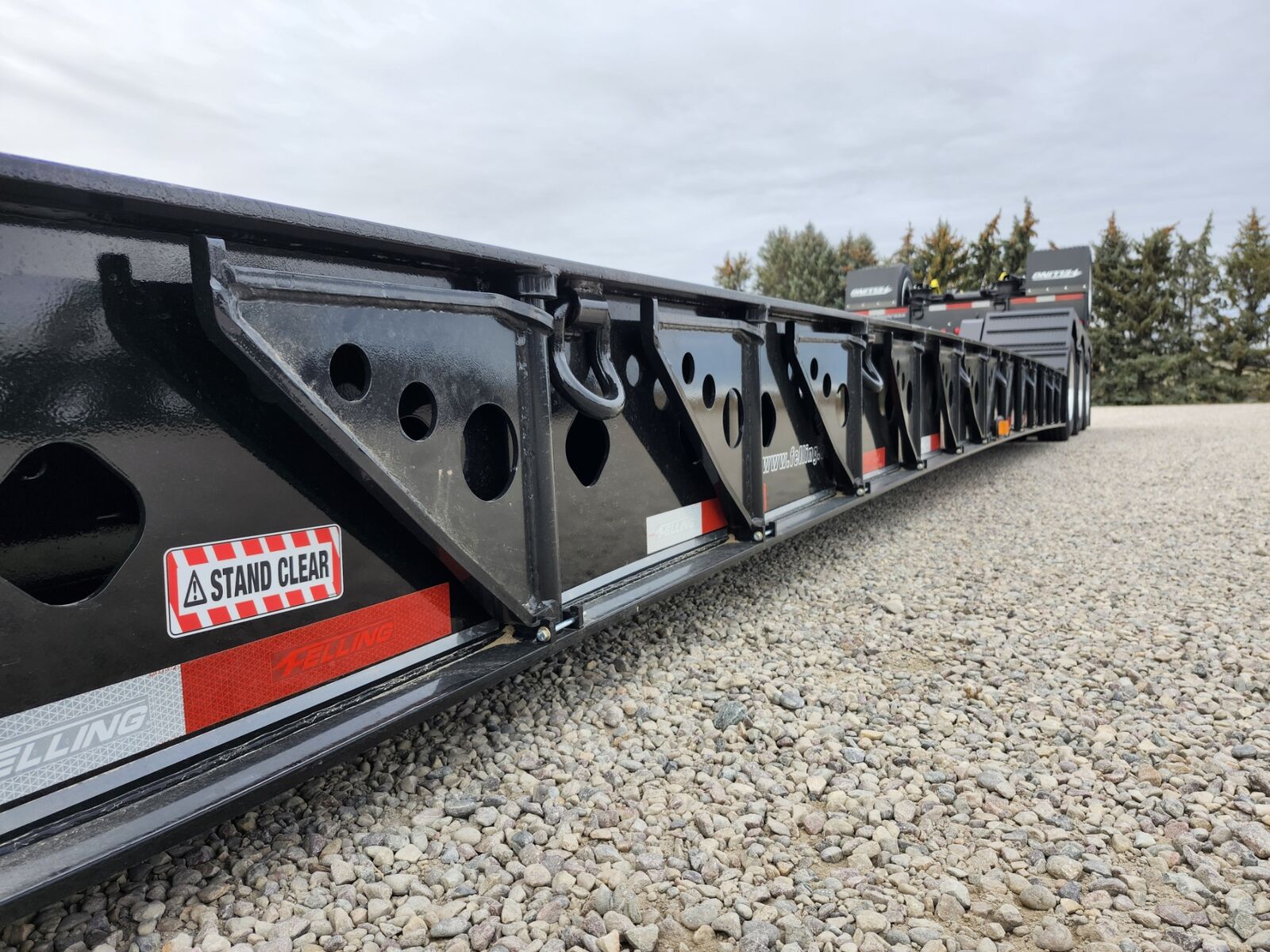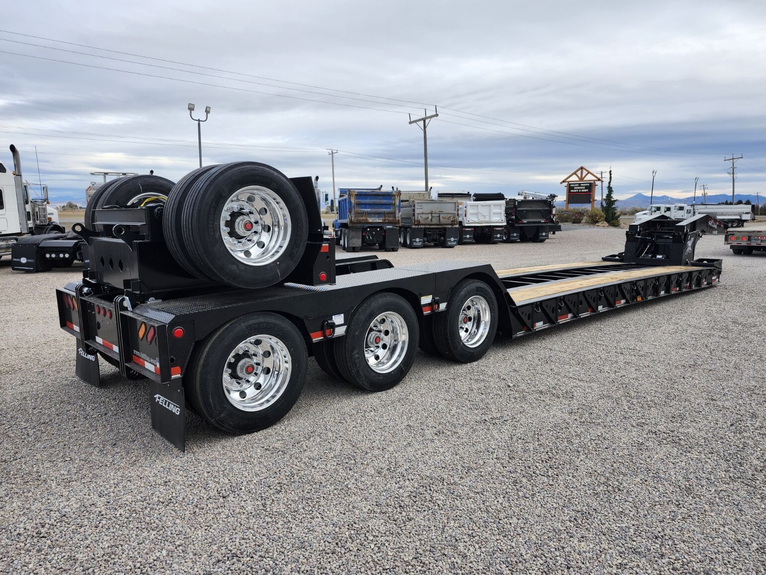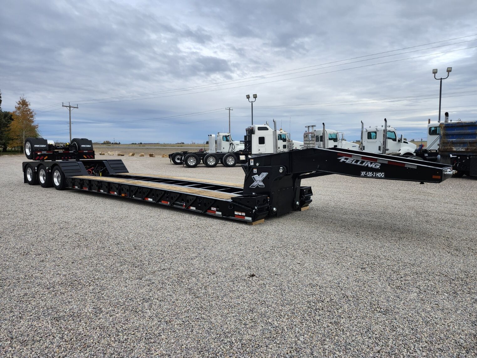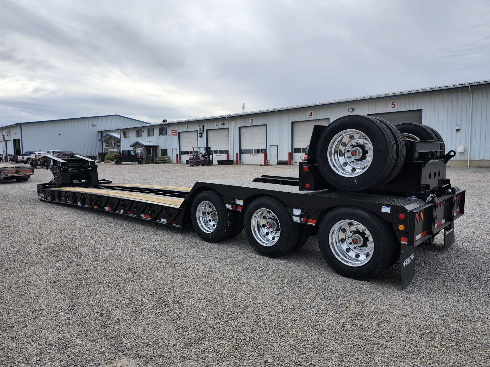 New 53' x 102", 139,500 lb capacity- 60 ton, 20,000 lb flip axle capacity, 25' well, 14' Rear deck, Full wheel covers, Wood deck, 24" Loaded deck height, 13' Hydraulic detachable neck with 108" swing clearance, 3rd axle lift, 12" Swing out outriggers, 5 position ride height cam blocks, 2 position kingpin, Trailer total empty weight of 23,550 including flip axle, 60" Axle spread, D rings, 26" Fold down front load access ramps, Manual 4th axle flip- 2500 lbs, (Price plus FET and taxes) In stock!!