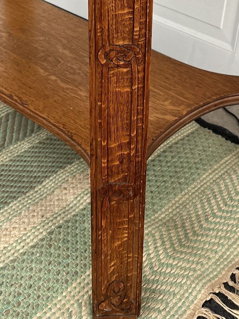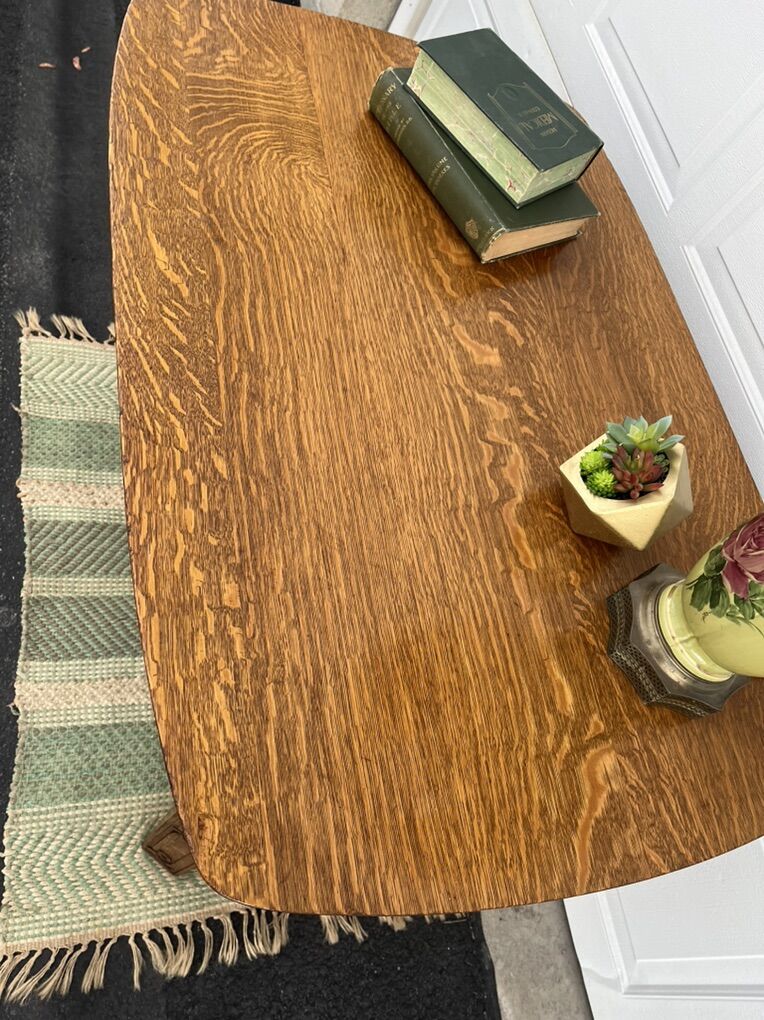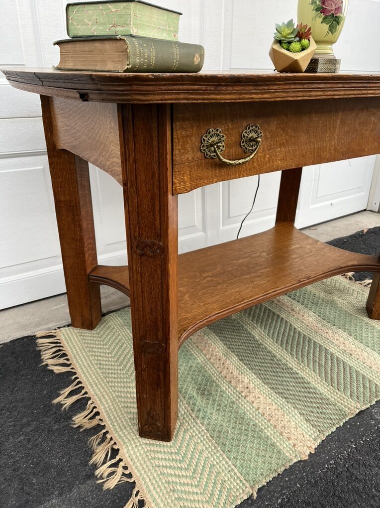 This beautiful antique oak library table/desk will add elegance to your home. Simplistic and stylish with unique carved knot detail on all 4 legs, original brass hardware and large drawer for storage. Measures 46 x 31, 30 tall. Pick up in River Heights,Cash preferred.