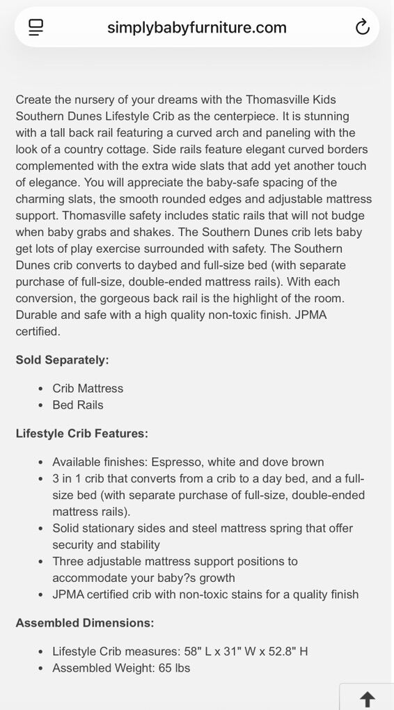 VenmoThomasville Kids Southern Dunes 4-in-1 Convertible Crib. Solid wood crib in color “espresso”. In great shape! Conversion kit for toddler and twin bed solid separately. Have all the parts and original manual. Retails for over $400. Cash or Venmo.