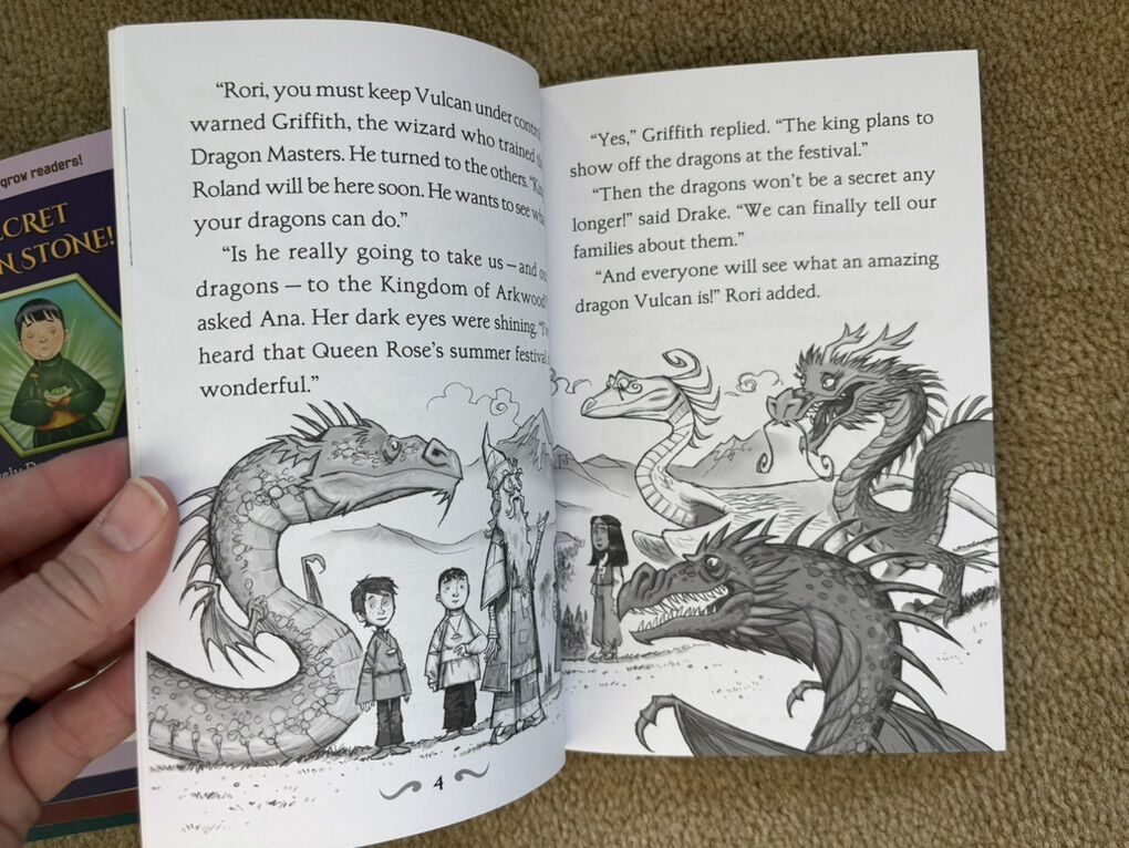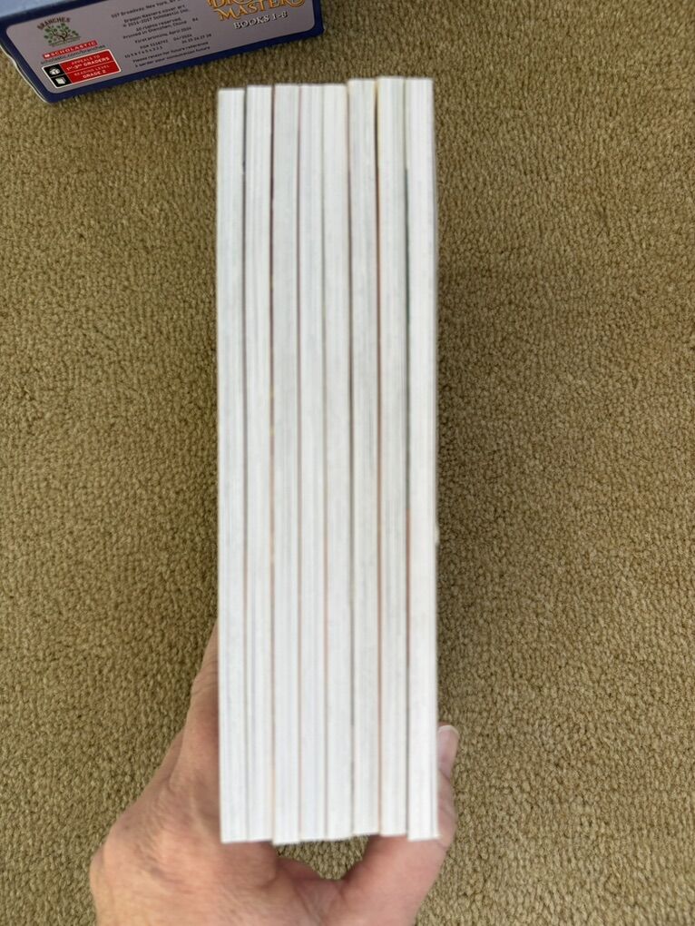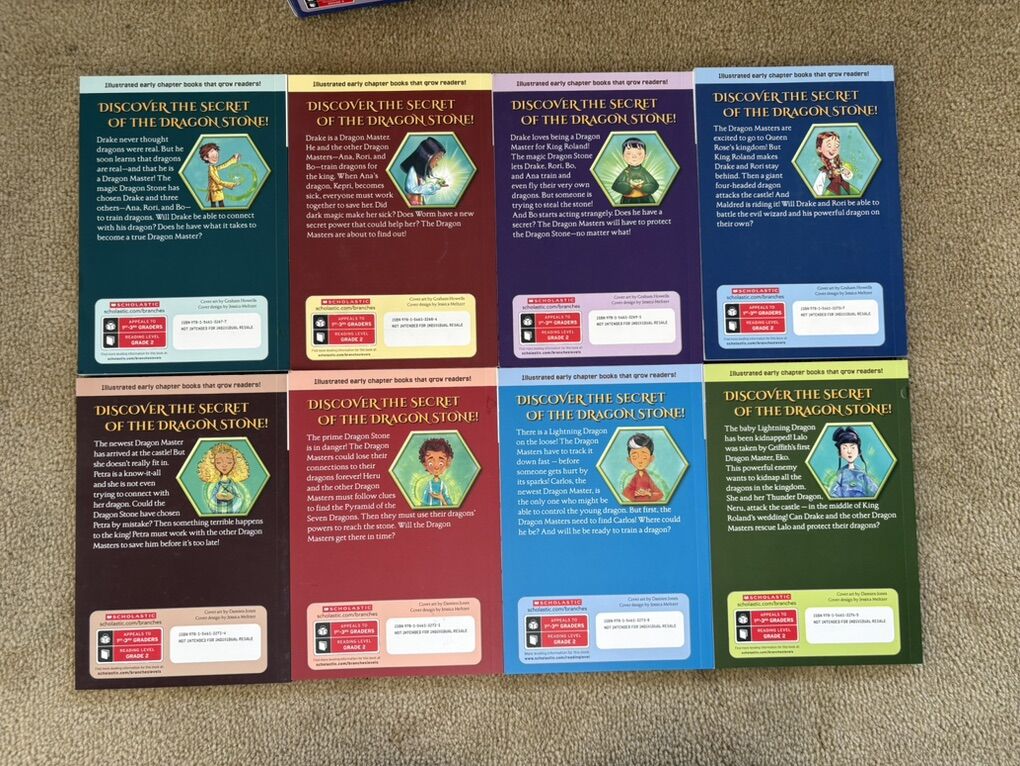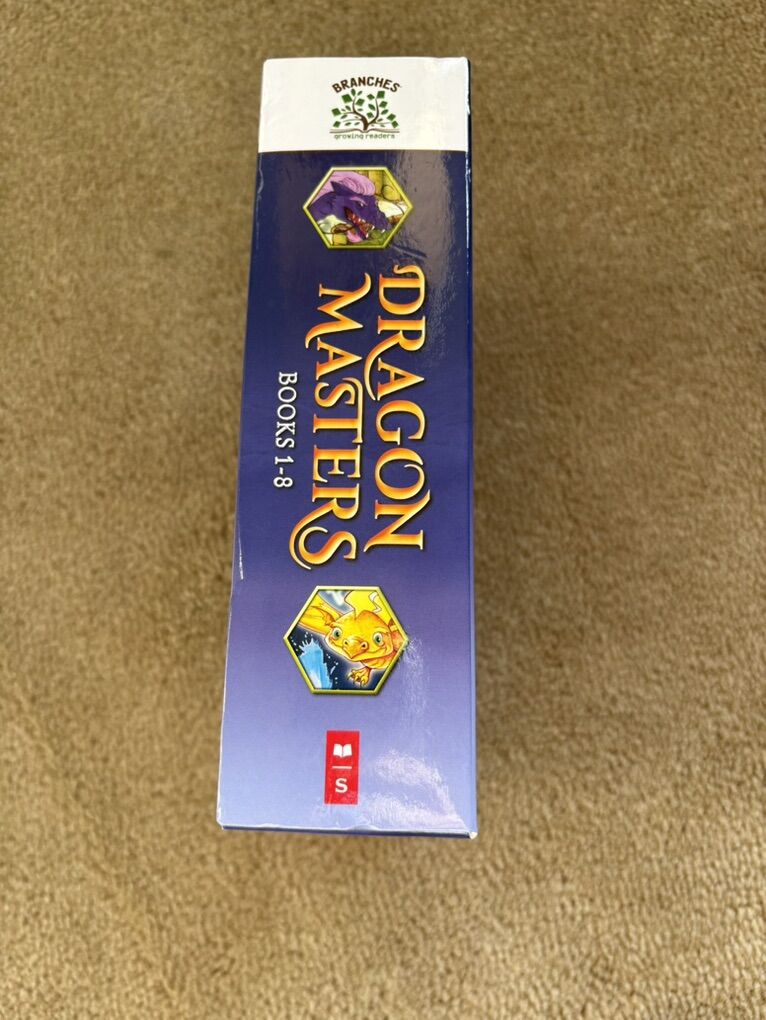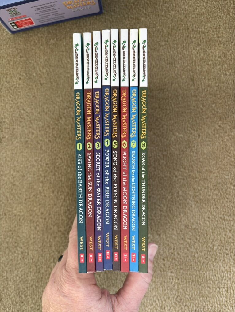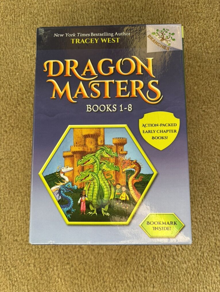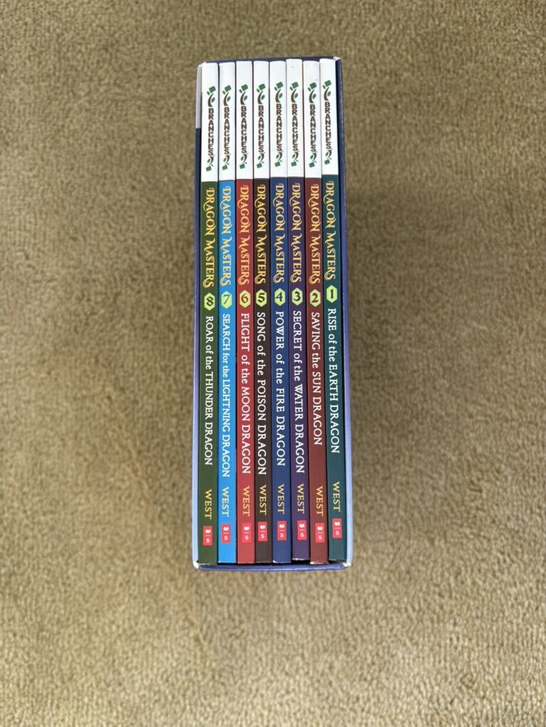 Dragon Masters Boxed Set, Books 1-8, by Tracey West. Scholastic, 2014-2017. Early readers, ages 6-8 years, each about 90 pages long, with illustrations. Paperbacks in excellent condition, in a sturdy slip cover. Text only. Cash or Venmo.