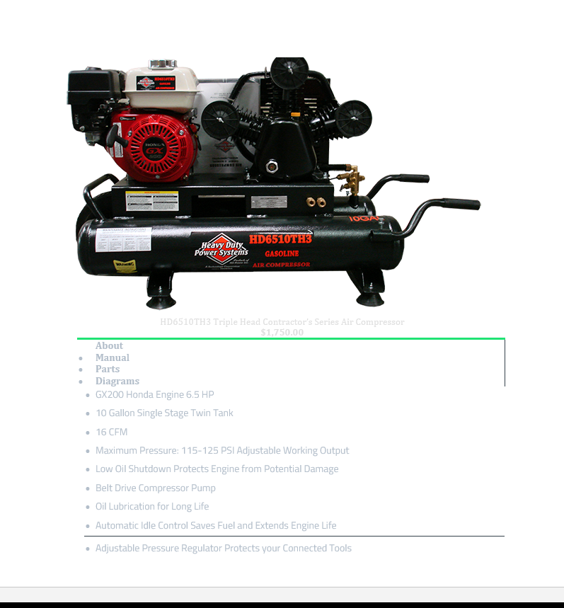 Heavy Duty Power Systems 10 gallon gas powered air compressor model #HD6510TH3 Honda GX 200, 6.5 Horse Power motor with a Triple cylinder compressor head, contractor series. Was a spare backup unit that has never been used and no longer needed. Retails new for $1,750.00