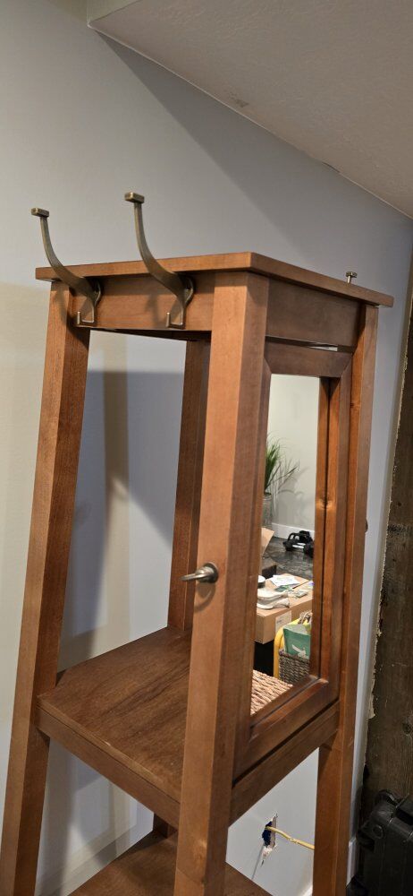 VenmoI have a beautiful wood coat and hat rack that is great for usage near the front door. It has 3 shelves for putting those necessities on or some nice decor. It has a nice pivoting build in mirror for that last glance on your way out the door. Very well built, very sturdy, and very beautiful real wood. In brand new condition.