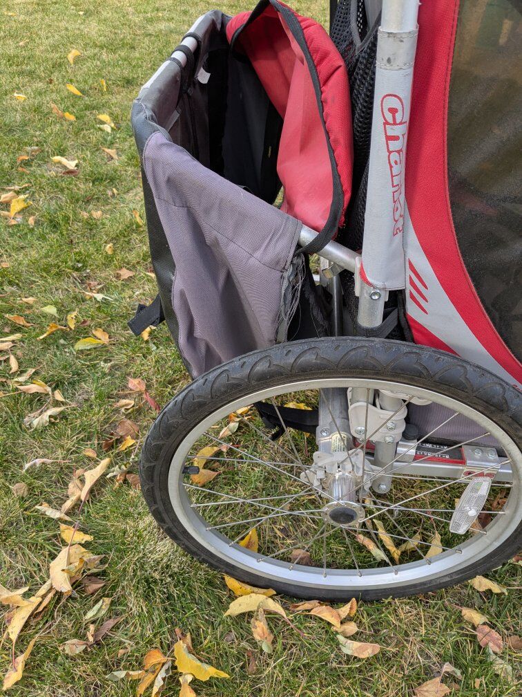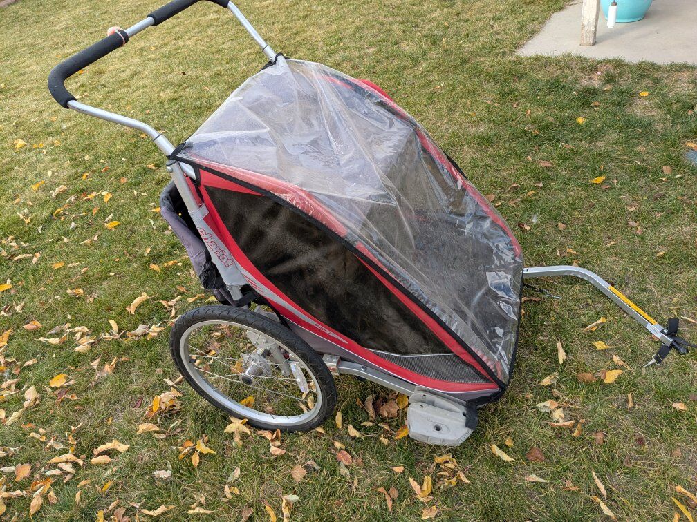 VenmoSeats one or two kids or suitable for hauling gear. Folds down flat and wheels come off for storage and transport. Comes with bike hitch and bike attachment. Thule Chariot can also be used for cross country skiing/snowshoeing if you buy the harness and ski attachments. You can also buy stroller and jogger wheels. The chassis has good bones, but see photos for tear in the cargo basket. Tires need new tubes. Only comes with clear plastic rain cover. There is no mesh cover. Cash or Venmo. Local pickup only.
