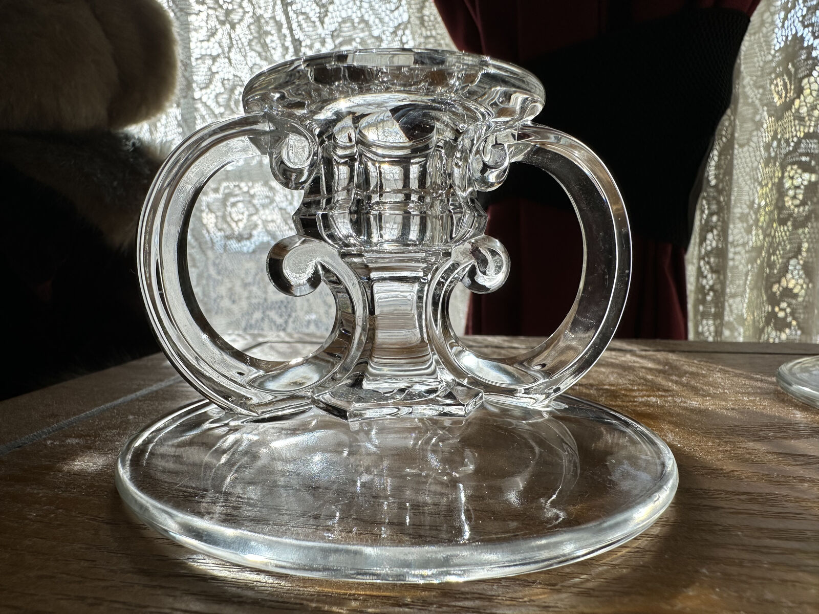 VenmoA vintage pair of clear, pressed glass, tapered candlestick holders, featuring sweeping curved handles. The "Block and Rib" pattern #408 by Smith Glass.