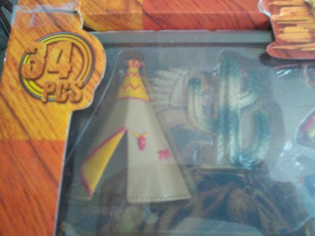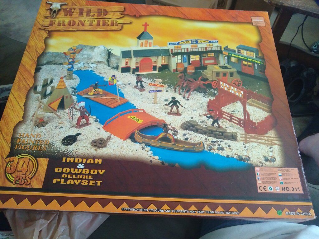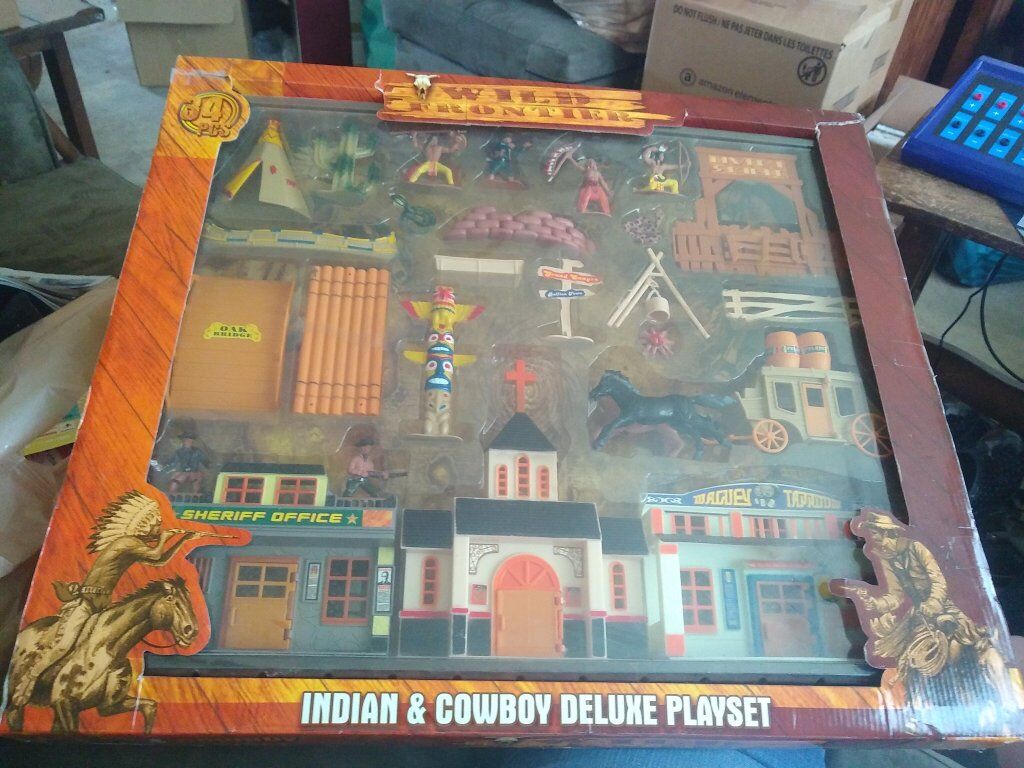 circa 1970's Wild Frontier Indian and Cowboy deluxe playset. In original box. The box is taped in a few spots. this is very nice. 34 pieces.