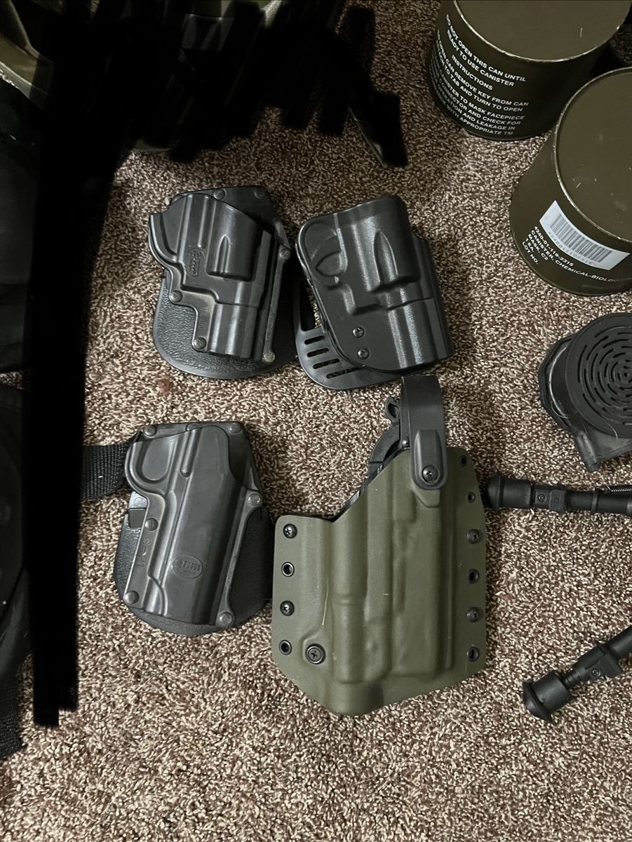 VenmoA bunch of stuff to get rid of. Will sell you what you want. Have 4 holsters, 2 are for a 1911 and the other two are a Taurus .38 revolver. 2 gas mask cartridges never been open, AR mag pouch, old school military gas mask voice amplifier (not sure if it still works, used to), rifle sling, signal horn refill, Shakespeare fishing reel that matches with Durango rods (no rods), and finally a pair of H2Odyssey neoprene snorkeling fin socks. Let me know what you want or what you’re interested in.
