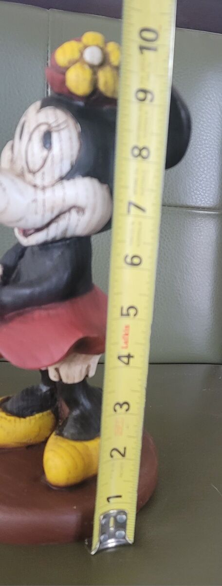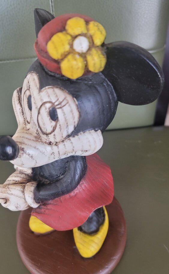 PayPalI am selling the cutest fun, vintage Minnie Mouse statue figurine. I believe she is from the Disney Store, made in the 1980's. Wood, or simulated wood material but feels and looks like wood. Very good condition with very minimal signs of wear. This Minnie would make a fabulous unique gift for the Disney lover in your life, or a great piece to add to your own collection. She stands about 10.5 inches tall. No markings, but does have a price tag on the bottom of the vase.