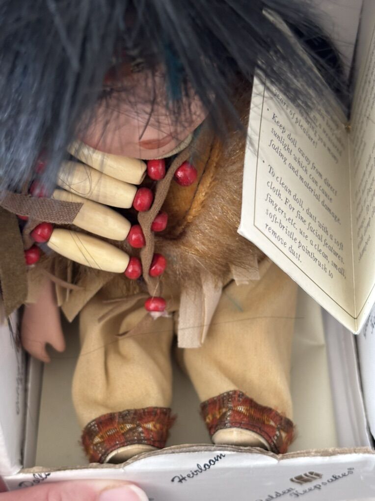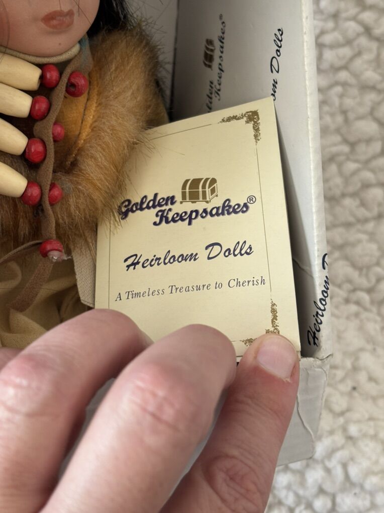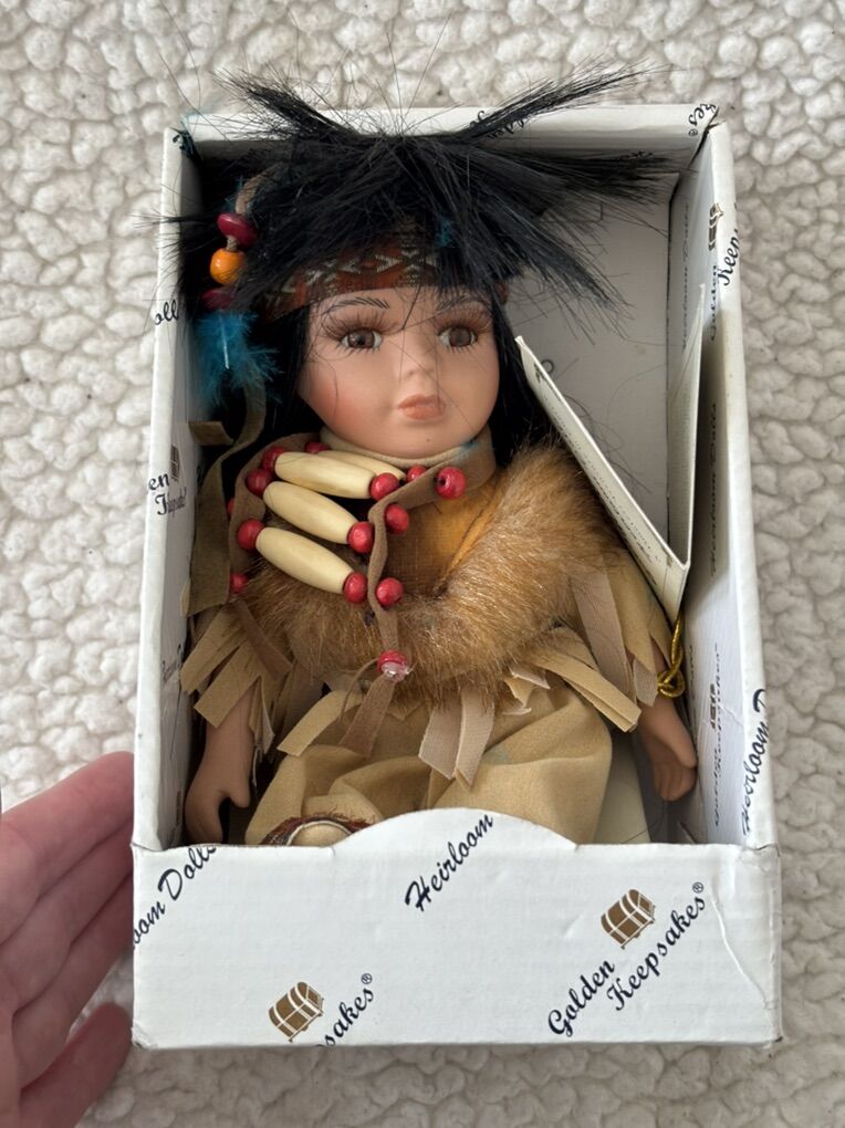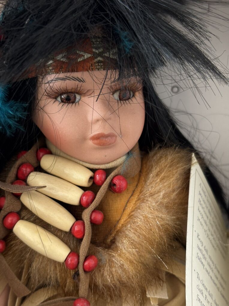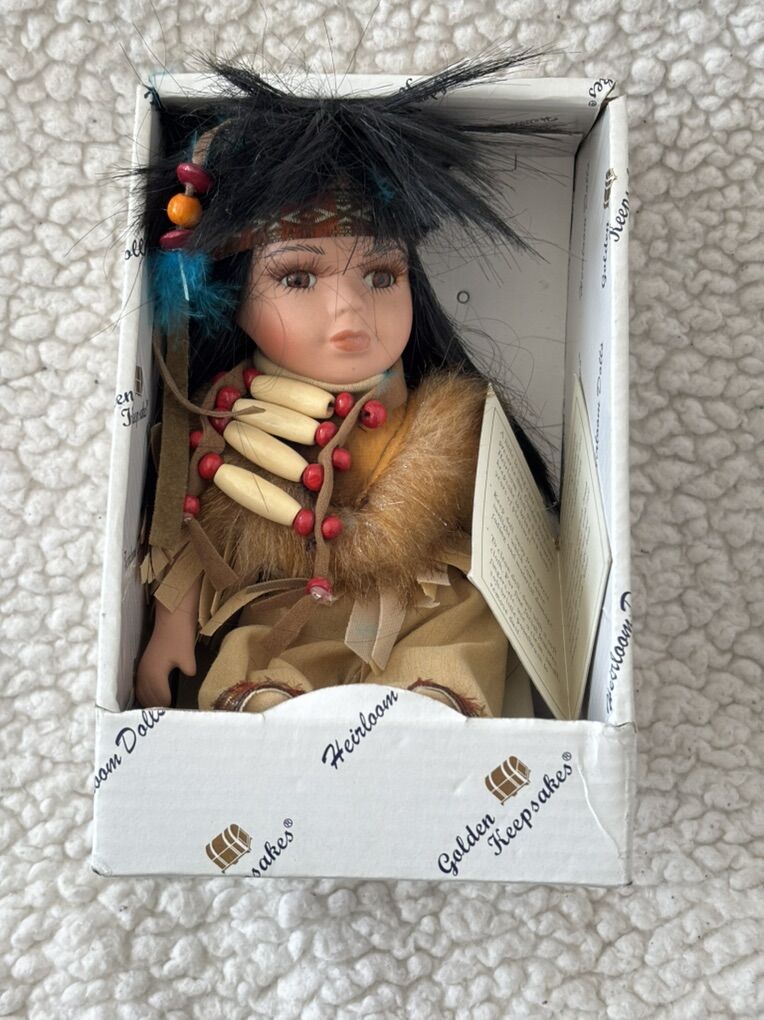 Collectible Golden Keepsake Heirloom Porcelain Doll. Dressed in Native American Clothing Doll is missing decorative beads in her hair. Payment and pick up are at the same time. Thanks